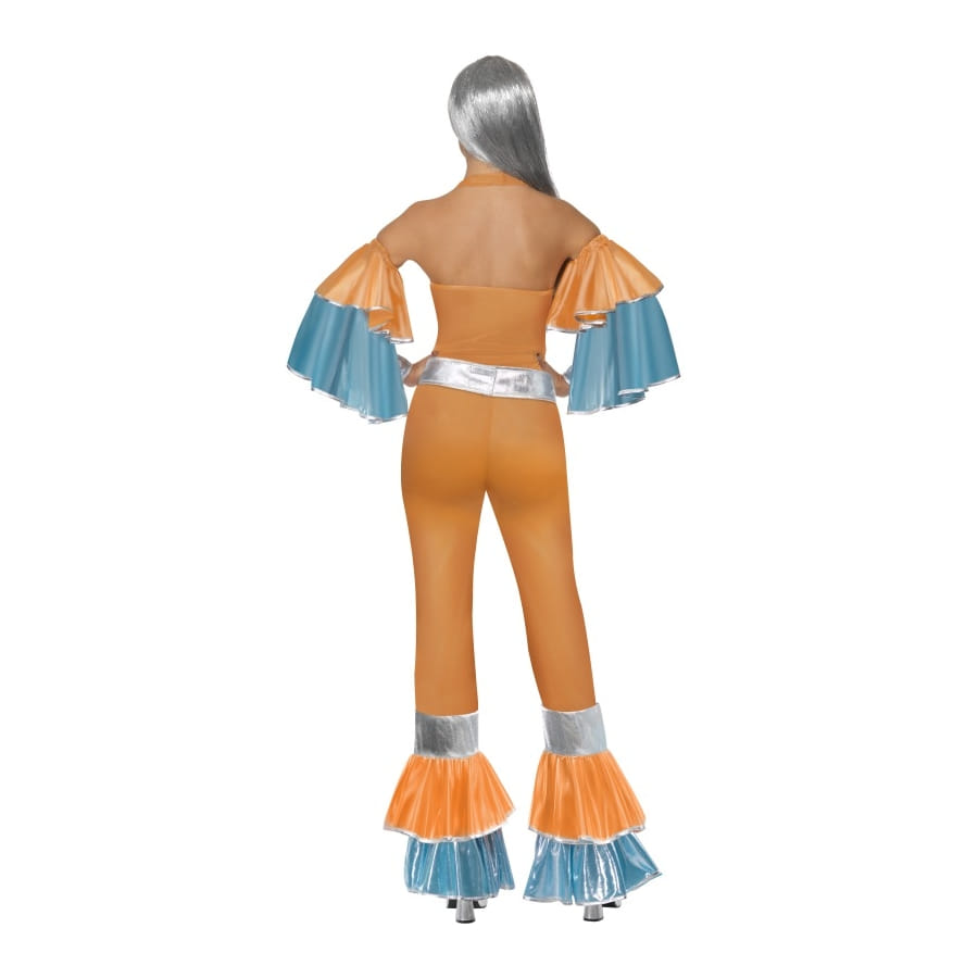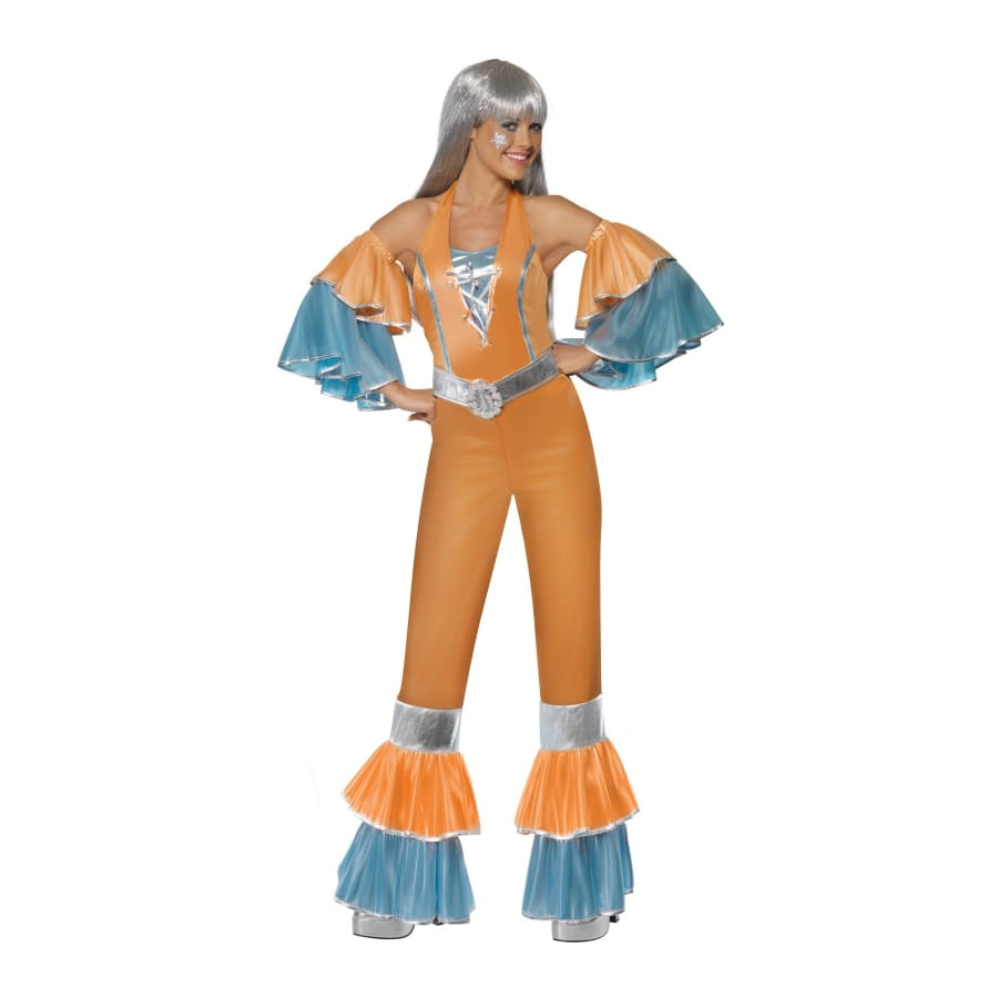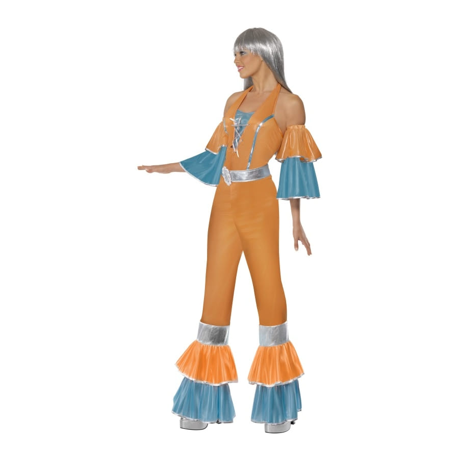 Déguisement froufrous inspiré des années 70, pour femme, composé d'un top, d'un pantalon et de manches de couleur bleue et orange avec bandes argentées. Ce déguisement funky est parfait pour une fête disco ou pour une tenue de chanteuse des années 70. Il est disponible en taille S, M ou L.