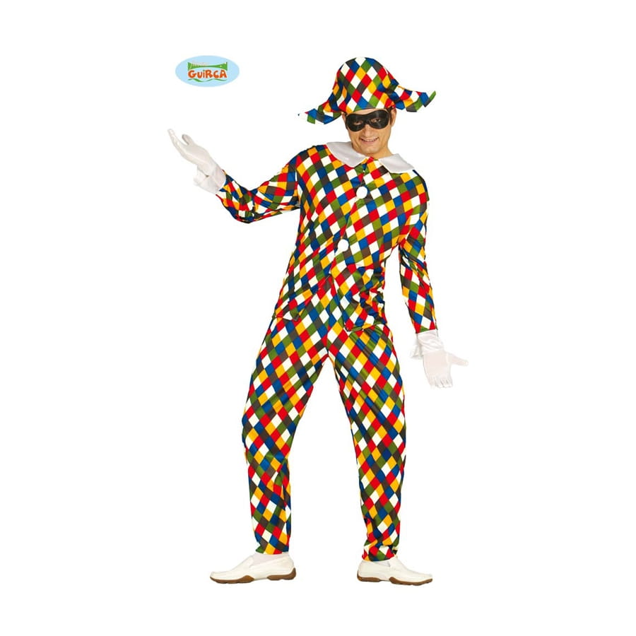 Dans toute fête déguisée, les couleurs jouent un rôle important. Plus il y a de couleurs, plus la fête est agréable et conviviale. Alors, à l'occasion d'un carnaval, d'une fête d'anniversaire ou d'une soirée déguisée, n'hésitez surtout pas à opter pour ce déguisement arlequin multicolore pour homme. Ce produit se compose d'un ensemble veste et pantalon en tissu à carreaux multicolores et d'un chapeau en mousse souple assorti. La veste à manches longues est dotée d'un col Claudine blanc et se ferme grâce à de gros boutons blancs, tandis que le pantalon est élastiqué à la taille. Obtenez un meilleur résultat en ajoutant un demi-masque noir et des gants blancs, à retrouver dans la section des accessoires Happyfete