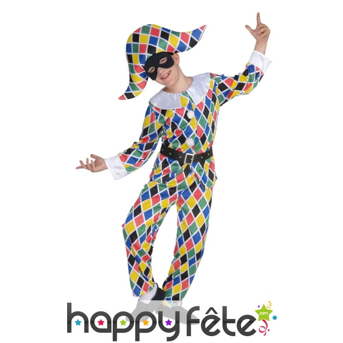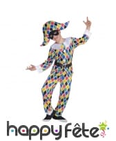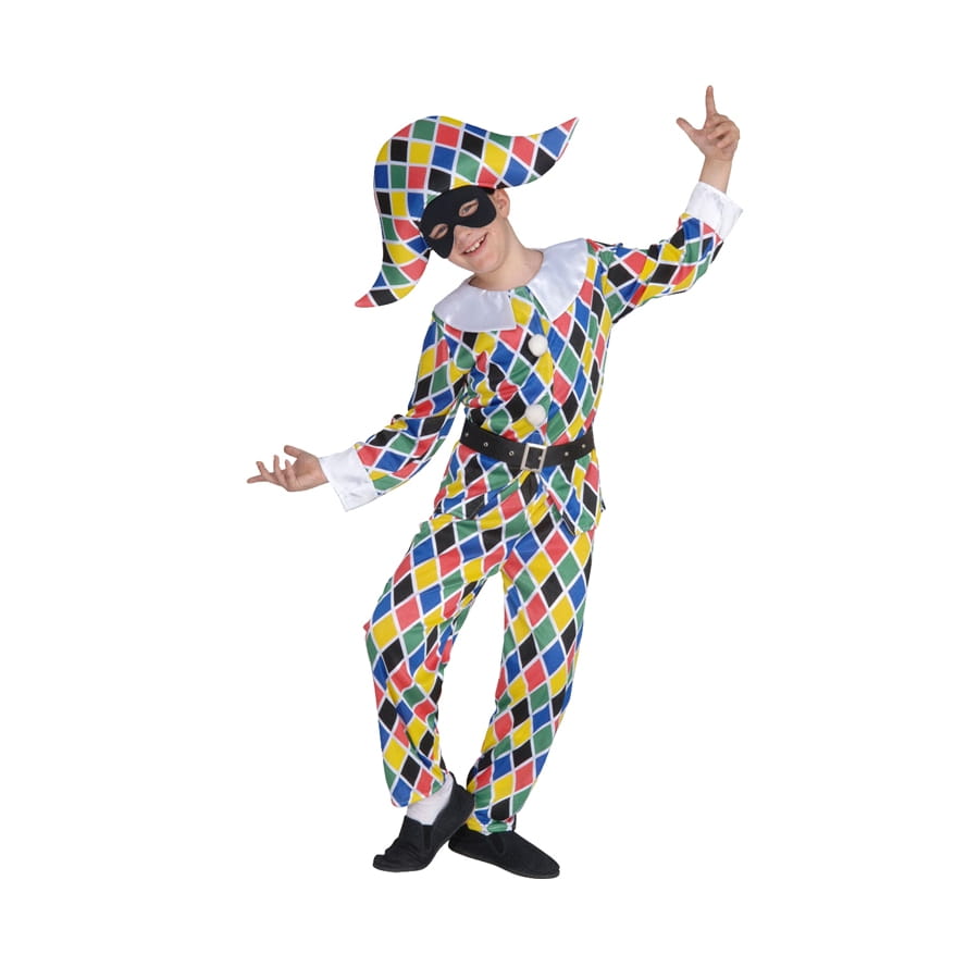Faire le clown est-elle la spécialité de votre petit garçon ? Ce déguisement Arlequin pour enfant lui ira sûrement à merveille. Et en plus, il va adorer toutes les couleurs qui ornent cette tenue. Une veste compose ce costume, avec des carreaux multicolores : rose, jaune, bleu, vert, noir et blanc, avec un col claudine de couleur blanche, des boutons blancs et les bords des manches, blancs également. Le pantalon a les mêmes carreaux multicolores que la veste et il en est de même pour le chapeau qui est allongé sur la largeur avec des bouts pointus. Une ceinture de couleur noire avec une boucle rectangle argentée complète le tout.