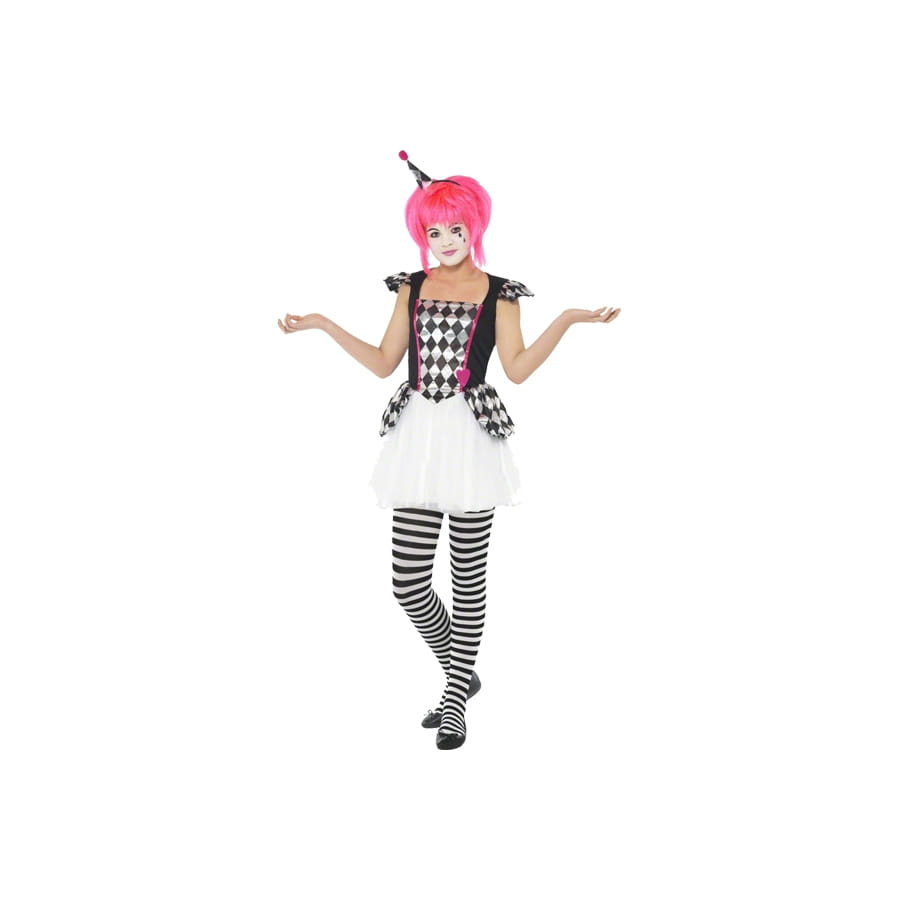 Set de déguisement d'arlequine, pour adolescente, composé d'une jolie robe blanche avec imprimés argents et noirs et d'une serre-tête monté d'un mini-chapeau assorti. Les tailles que vous offre notre site conviendra parfaitement à une adolescente de 13 à 15 ans. C'est un déguisement jovial que pourra porter votre fille lors d'une fête vénitienne.