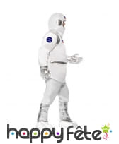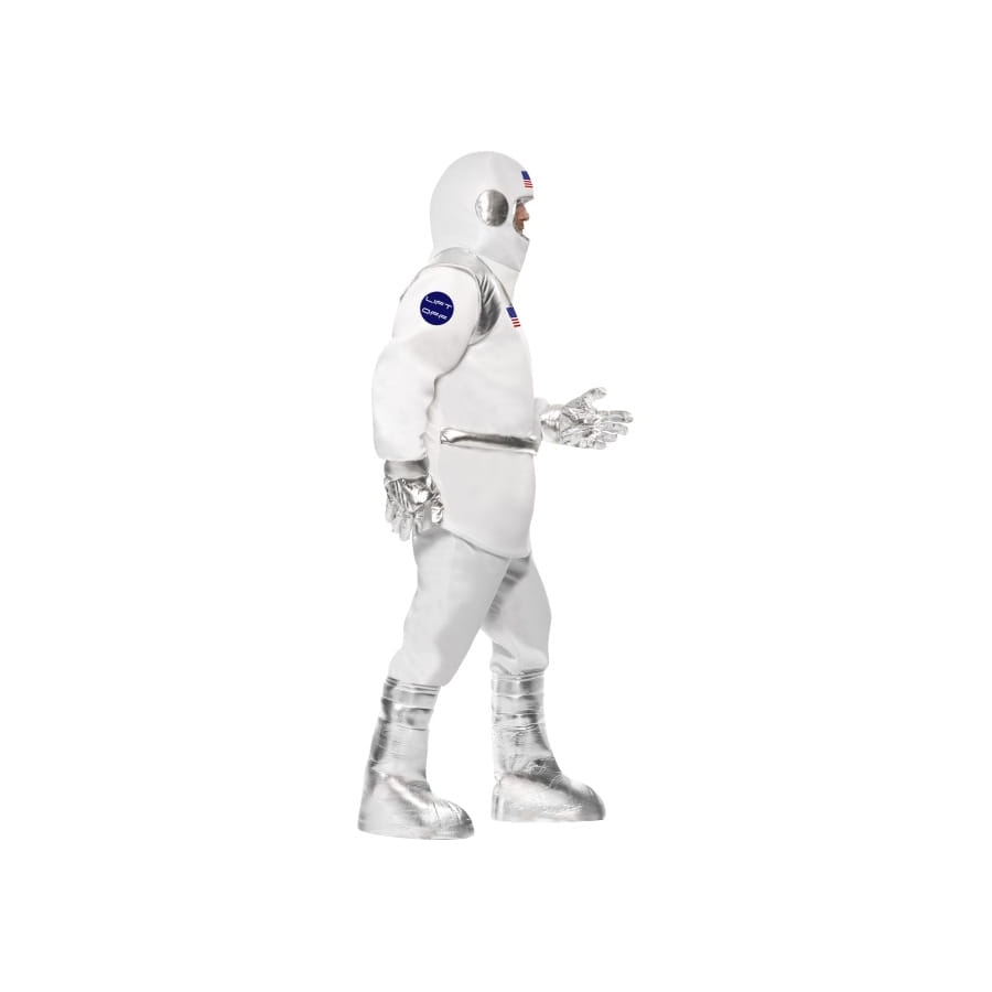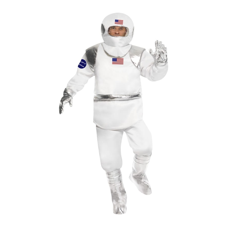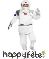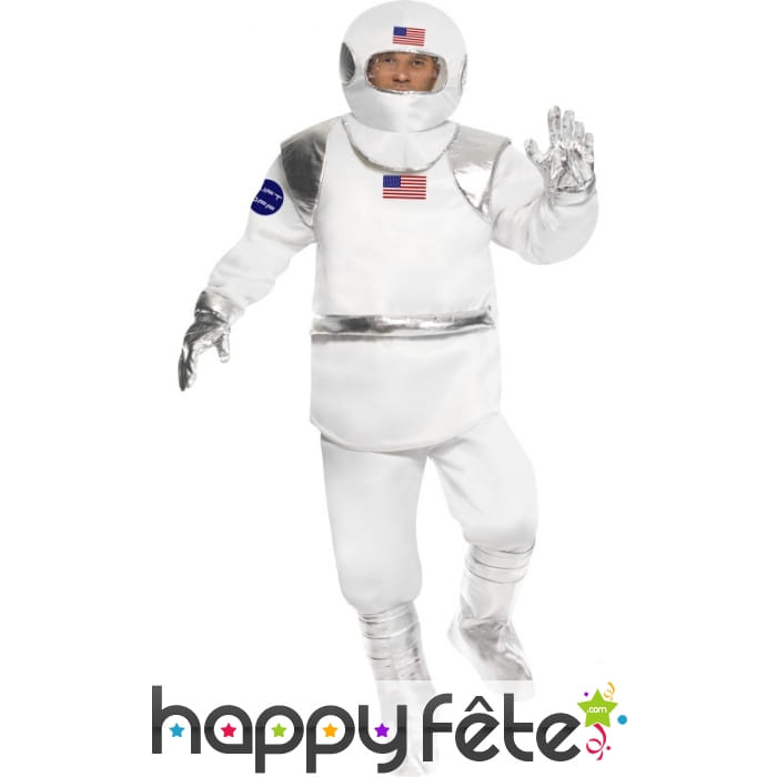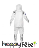Déguisement d'astronaute, pour homme, composé d'un top, d'un pantalon, d'une paire de gants et de couvre chaussures. Le top et le pantalon sont blancs, avec quelques touches argentées tandis que les gants et les couvre-chaussures sont argentés. Voici un déguisement qui conviendra à bon nombre d'occasions.