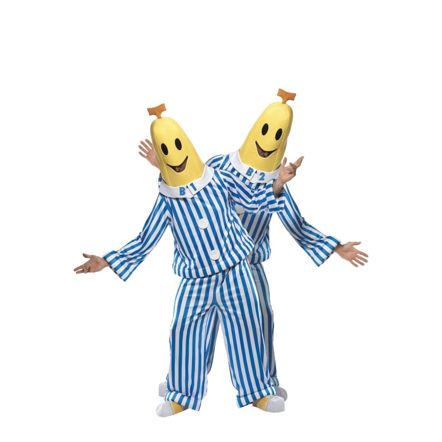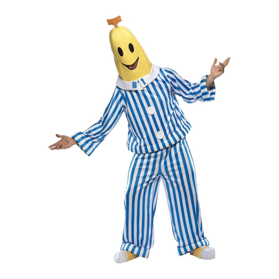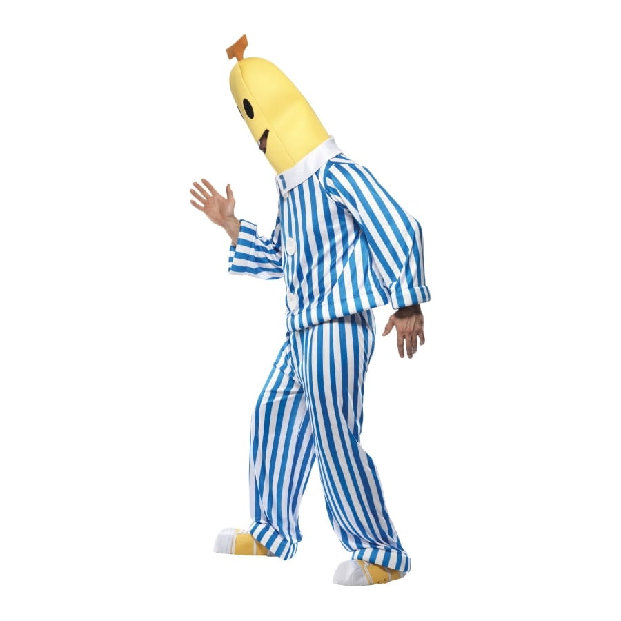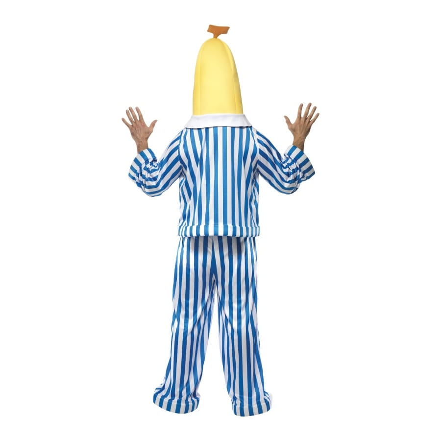 Ce déguisement de banane pyjama fera sourire plus d'un. Parfait pour une fête ayant pour thème l'humour, ce déguisement licence bananaman est composé d'une tête jaune avec un visage qui sourit dessus, d'un top manche longue de couleur blanc et bleu, d'un pantalon de la même couleur que le top ainsi que de couvre-chaussures blanche et jaune.