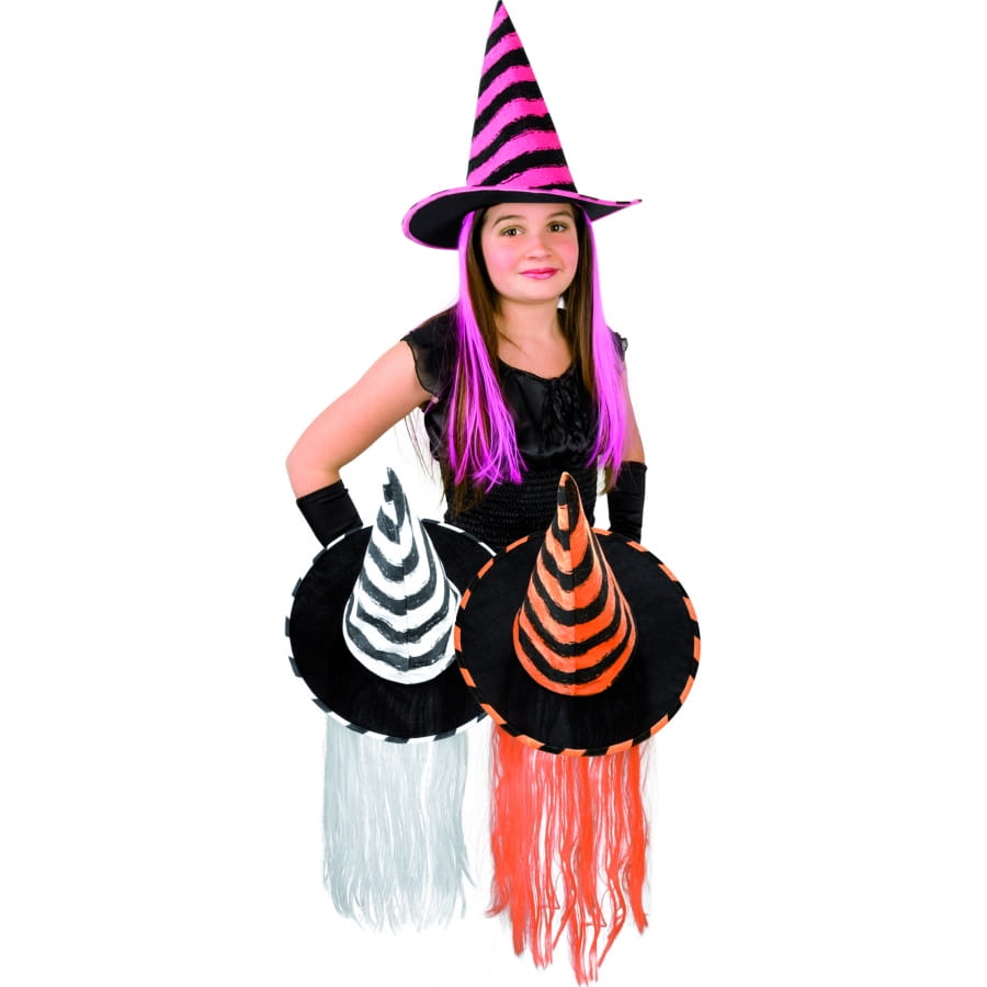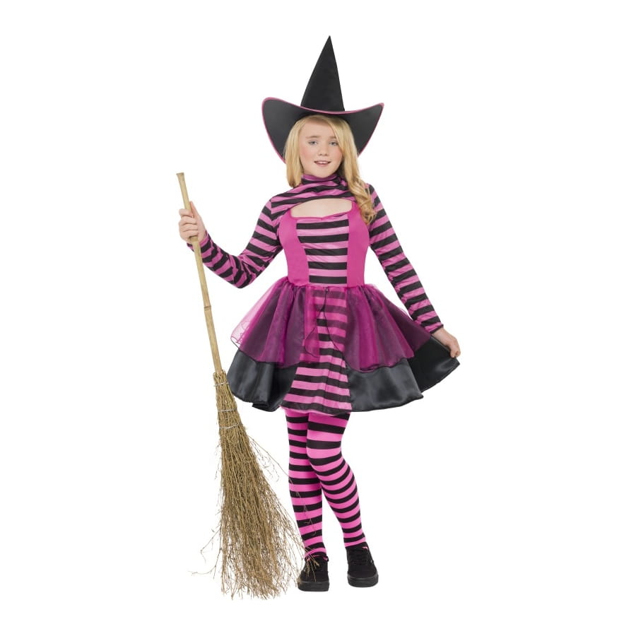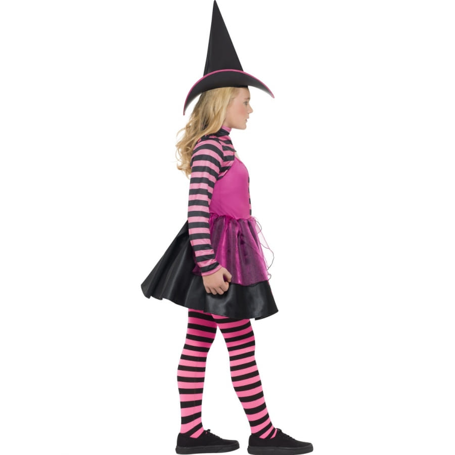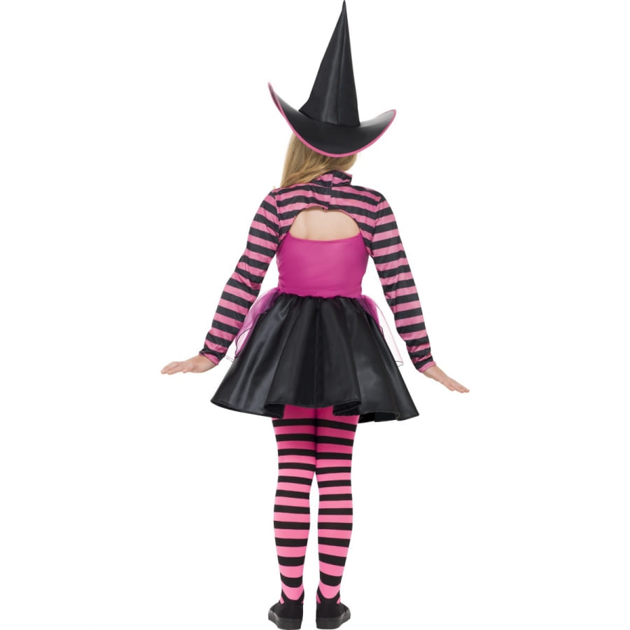 Déguisement de sorcière, pour fille, composé d'une robe et de manches. Les deux accessoires sont à rayures roses et noire, la robe comportant un jupon en tulle rose et en satin noir. La tenue de sorcière de votre fille possèdera une petite touche gothique et mignonne à la fois. Le tout est disponible en taille S, M ou L.