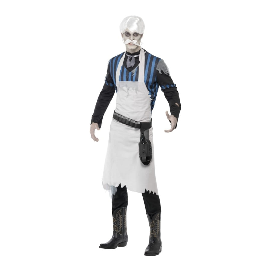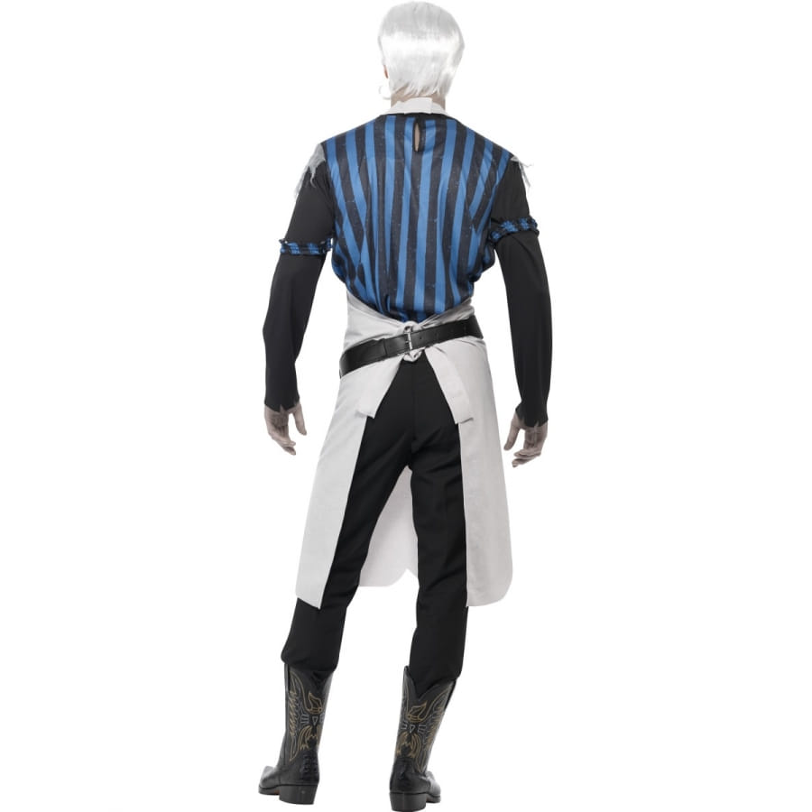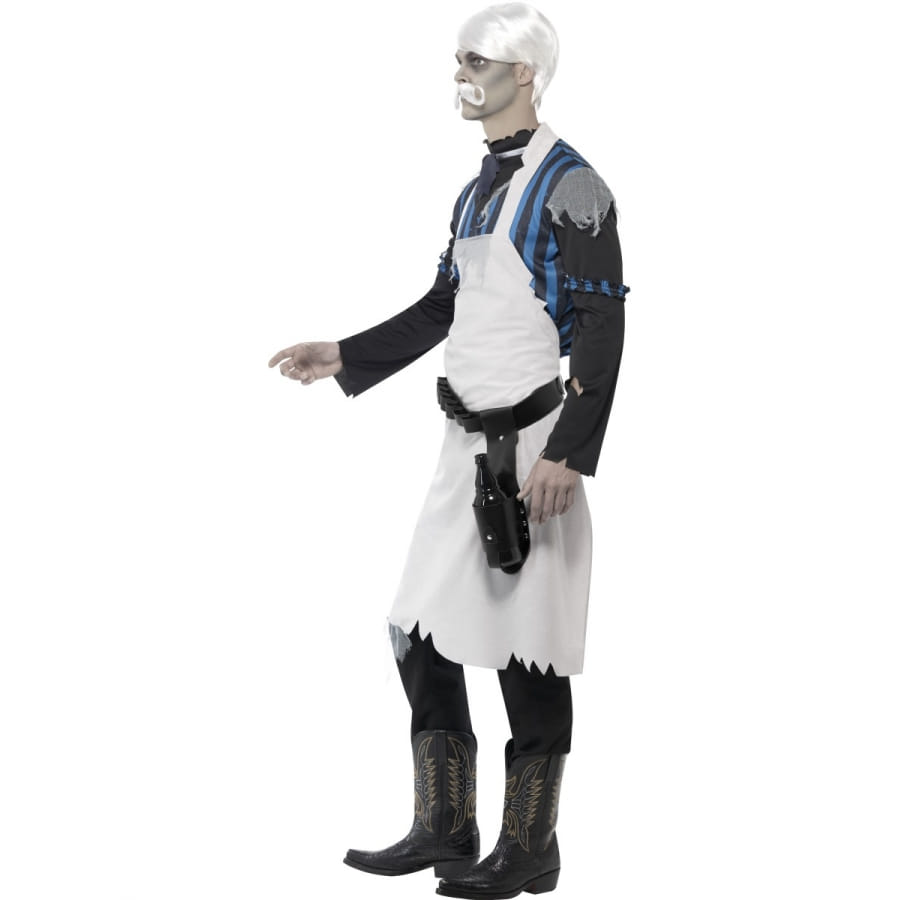 Déguisement de barman fantôme, pour homme, composé d'un top à rayures bleues et noires et d'un tablier blanc avec ceinture à bouteille et shots. Choisissez entre une taille S, M ou L au moment de votre commande. Avec son aspect déchiqueté et délabré, cette tenue fera de vous un barman digne d'une scène de "The Shining"!