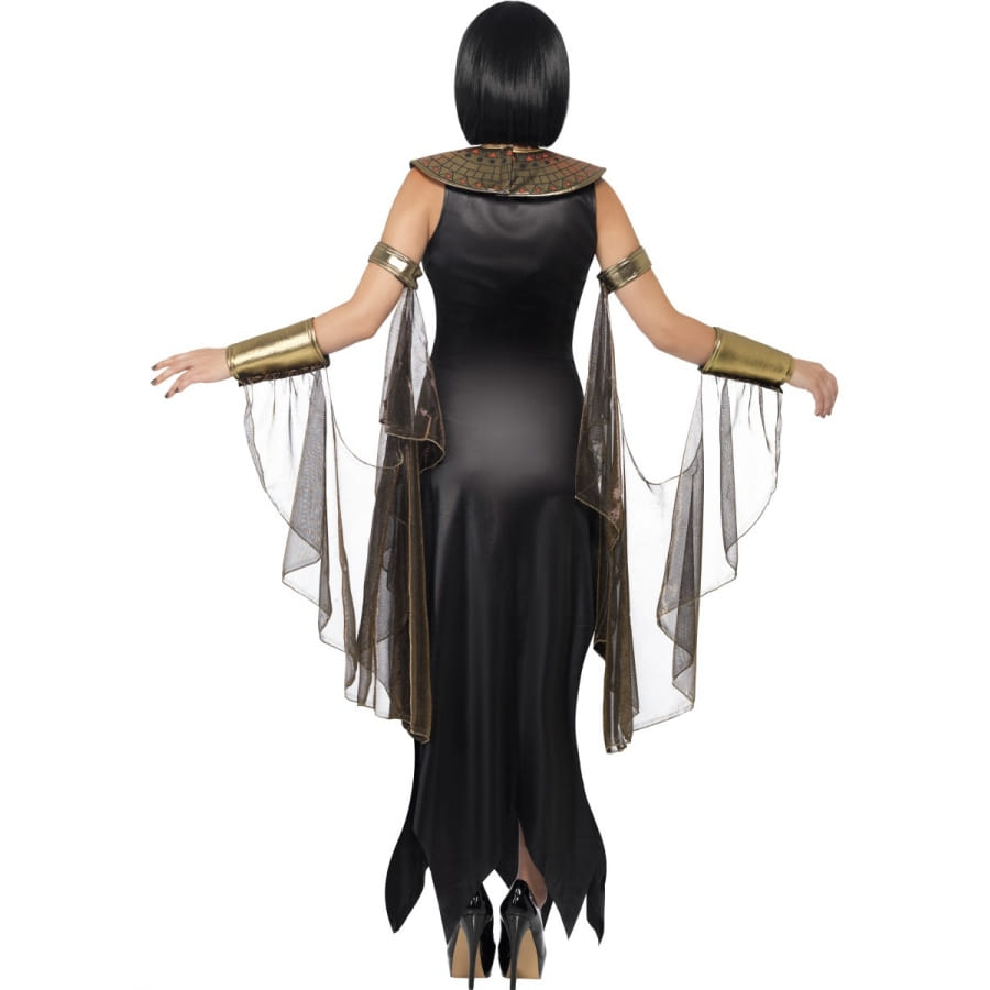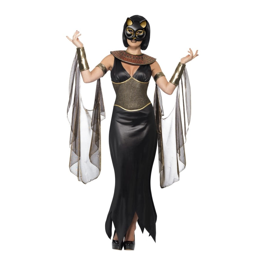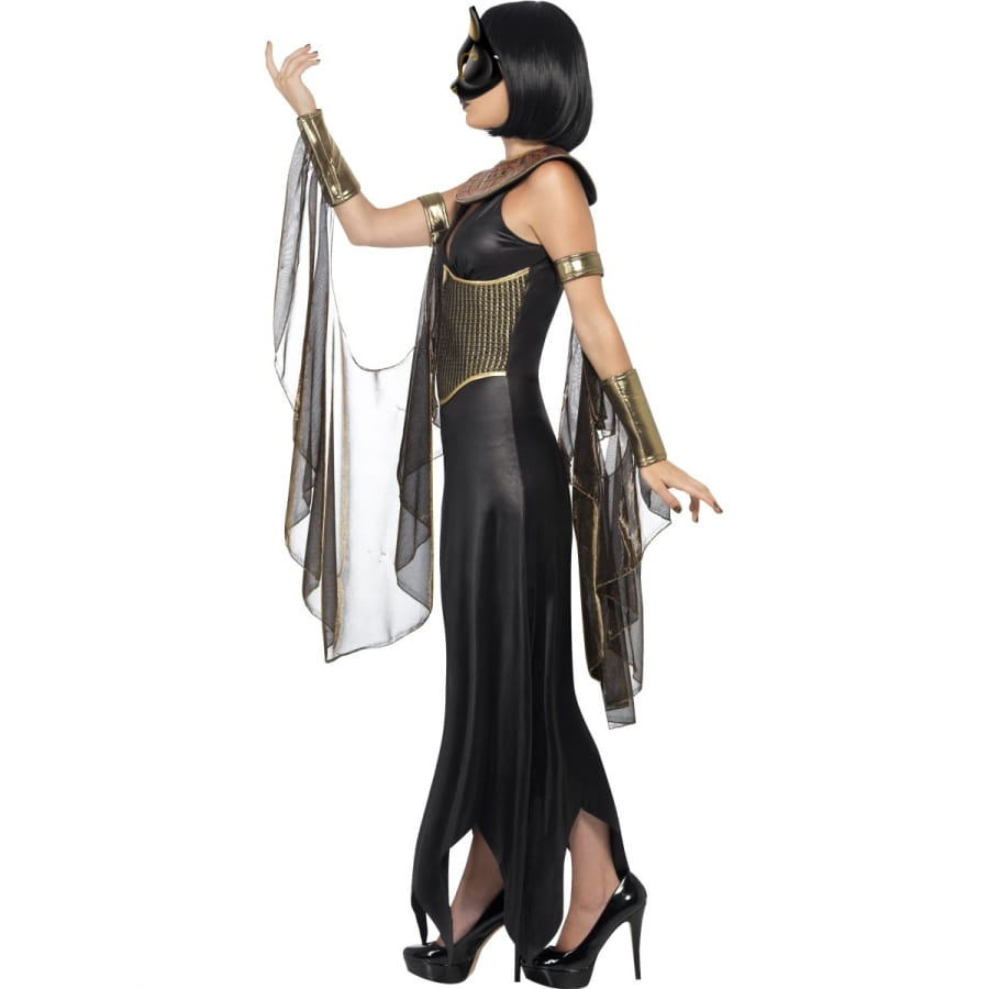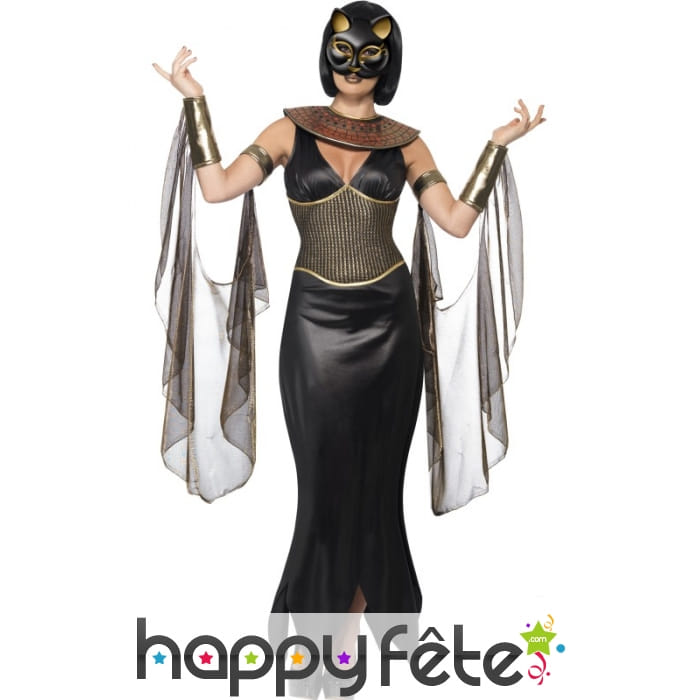 Si vous aimez la culture égyptienne, ce déguisement est fait pour vous. Plus que le déguisement d'une égyptienne ou même d'une reine d'Egypte, celui-ci les surpasse largement : la tenue de la déesse chat Bastet. Elle est composée d'une robe noire sur le fond, ornée d'une partie en or et bronze au milieu, d'un collier égyptien en or et bronze (faux), de manches drapées en voile et d'un masque identique à celui de la déesse, recouvrant votre visage et ne laissant apparaître que votre bouche. Il faut bien choisir le rouge à lèvres, nous vous en conseillerions un de couleur dorée. Des escarpins à talons noirs sont aussi de mise pour cette superbe tenue. Alors, qu'est-ce que ça fait de se glisser dans la peau d'une déesse? Les tailles disponibles sont : S correspondant à une robe de taille 36 à 38. M : robe de taille 40 à 42. et L se référant à une robe de taille 44 à 46.