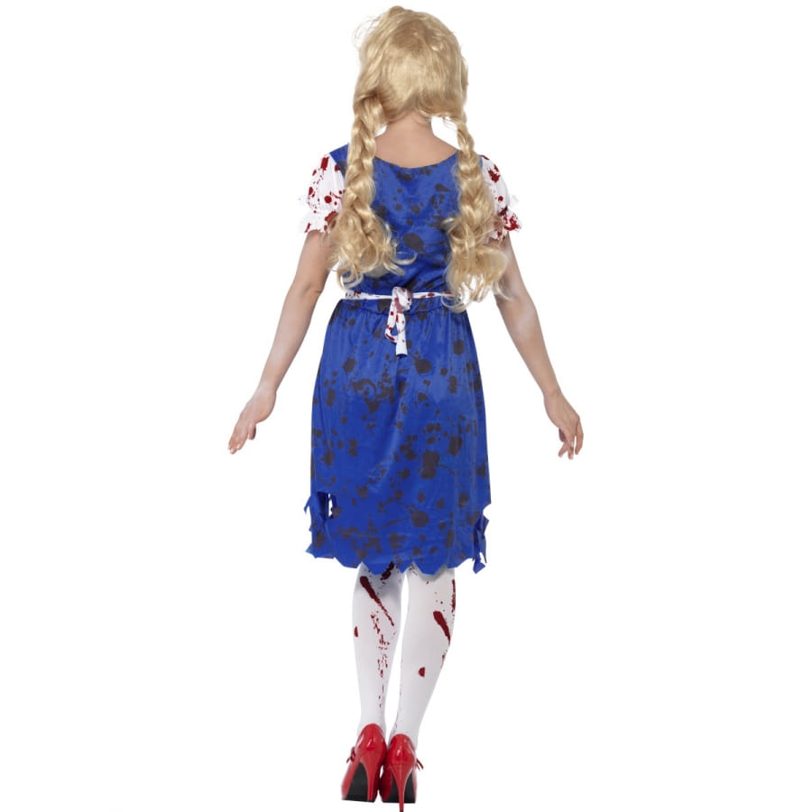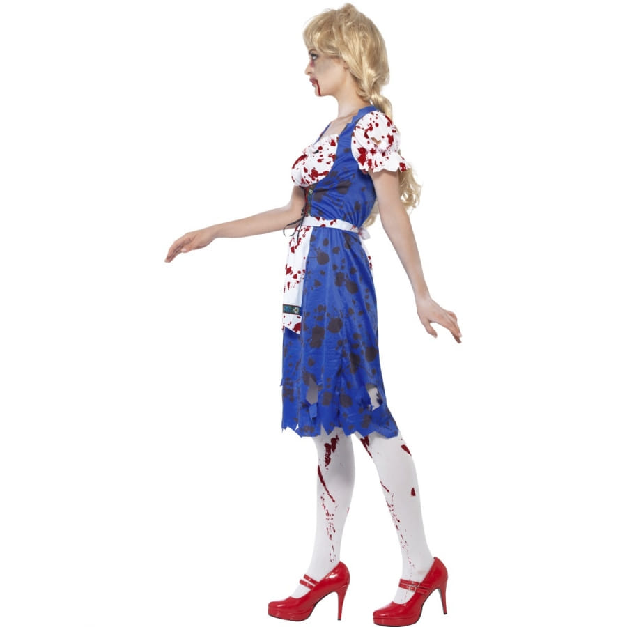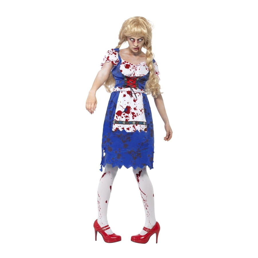 La Bavaroise-type est de nature chaleureuse et accueillante, ce qu'elle aime c'est la montagne et les fêtes de la Bière. Mais lorsqu'il s'agit d'une Bavaroise Zombie, c'est une toute autre chose. Celle-ci n'a d'intérêt que les cervelles humaines, non pas à la recherche d'une source d'intelligence mais juste pour le déjeuner. Cet Halloween, faites-vous plaisir en donnant la plus grande frousse de la vie à vos amis avec ce déguisement Bavaroise zombie. Il est disponible en taille S(36-38), M(40-42) et L(44-46) et se constitue d'une robe de couleur blanche et bleue entachée par ci et par là par un rouge imitant à merveille la couleur du sang des victimes de l'effroyable bavaroise. Portez-le avec des collants blancs et des chaussures à talons rouges, puis enfilez une perruque blonde nattée. Cette année, vous ne les raterez pas, effet d'épouvante garanti! Costume à nettoyer à sec.