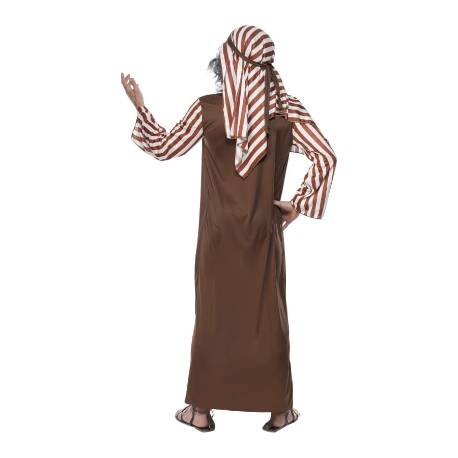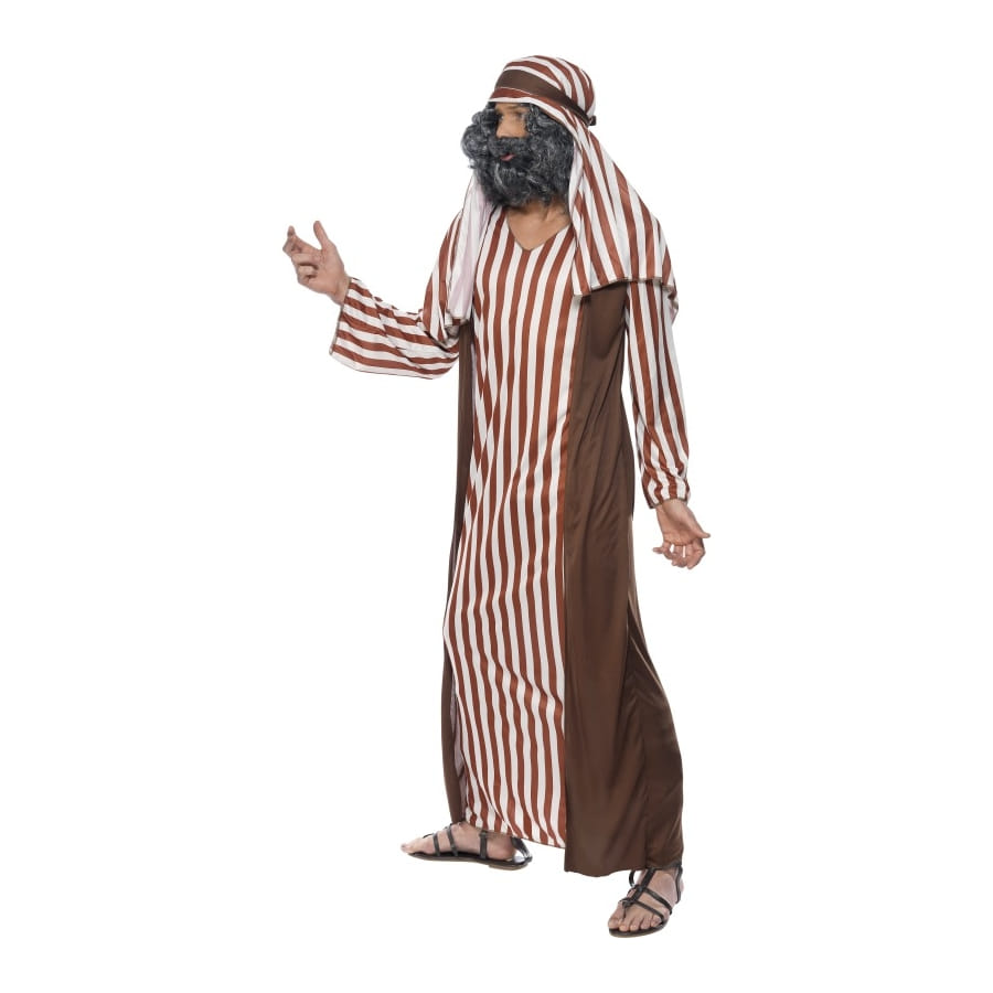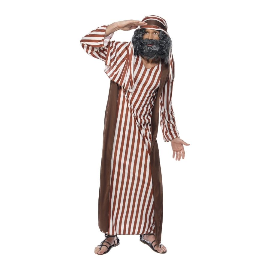 Déguisement de berger homme nativité, composé d'une longue robe à rayures rouges et blanches et d'un foulard assorti. Ces deux accessoires feront de vous un berger historique ou médiéval, selon le thème de votre soirée.