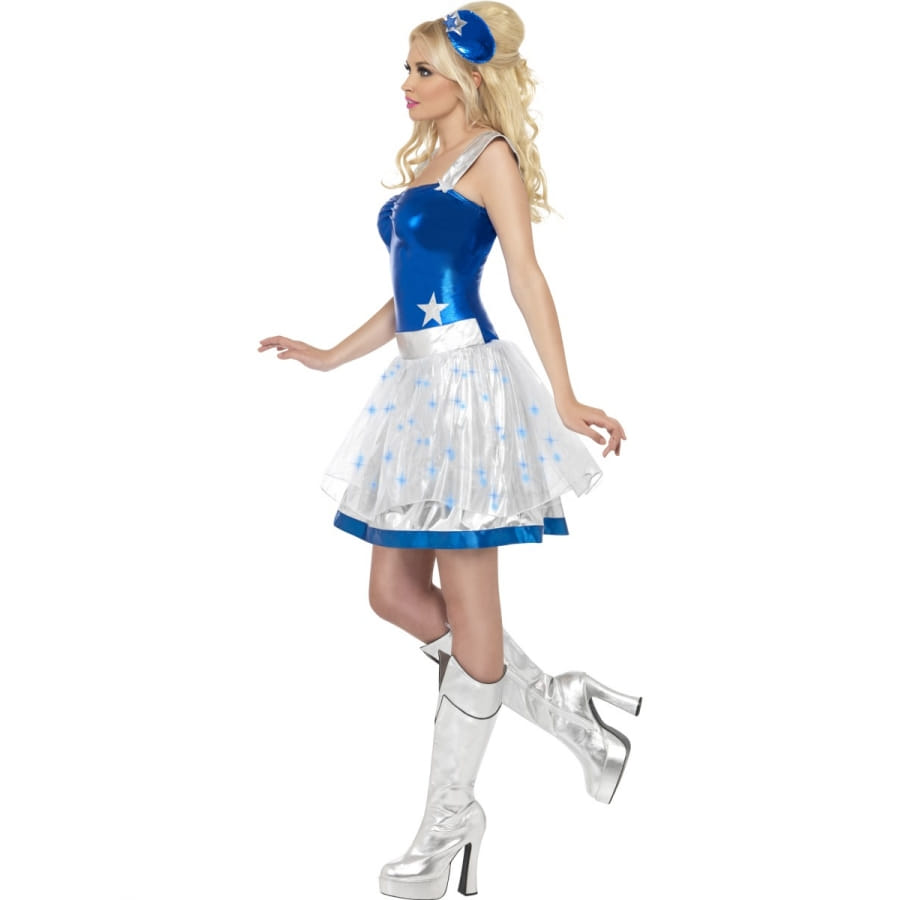 Ce déguisement est composé d'une robe avec bretelles de couleur blanc et bleu avec des petits motifs sur le bas de la robe, il est aussi composé d'un chapeau de couleur bleu. Vous pourrez porter ce déguisement pour une fête comme un enterrement de vie de jeune fille ou encore pour un thème comme futuriste.