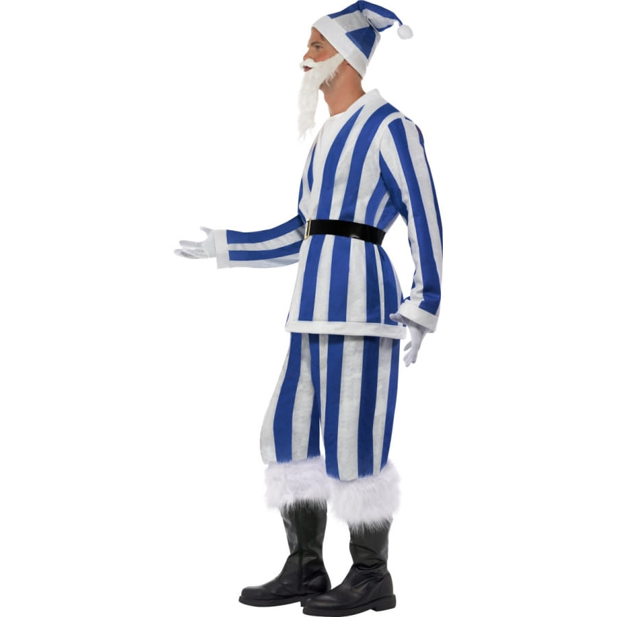 Déguisement de Père Noël à rayures bleues et blanches, pour homme, composé d'une veste, d'un pantalon, d'un chapeau à pompom, d'une barbe blanche et d'une ceinture noire. Avec cet ensemble, vous deviendrez un Père Noël pas comme les autres que tous les enfants auront envie d'accoster.