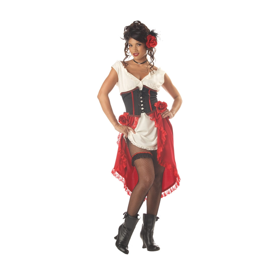 Vous êtes conviée à une soirée Cabaret ou Western ? Faites sensation avec cette magnifique tenue de danseuse de saloon, dédiée aux femmes. L'ensemble est composé d'une chemise blanche décolletée à manches courtes, d'un corset noir avec une jupe rouge, d'une jolie jarretière noire et rouge, et de trois roses rouges pour décorer le tout, pour orner les cheveux par exemple, à porter en bracelet ou à épingler sur le devant de la robe. Le corset se lace sur le devant pour bien ajuster la chemise. Ce déguisement est disponible en tailles : L/ M/ S. Mesdames, bienvenue dans le monde du Far-West !