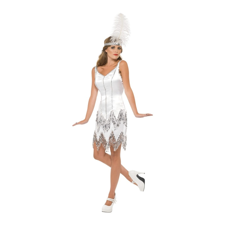 Ce déguisement de jeune fille délurée de couleur blanc vous pouvez porter cette magnifique robe à plusieurs occasion comme une fête sur les années 20 ou encore une fête ayant pour thème sexy ou charme. Ce déguisement de danseuse est magnifique tout en blanc cette robe avec des bretelles minces a des lignes argentés dessus. Il est aussi composé d'un serre-tête avec une plume.