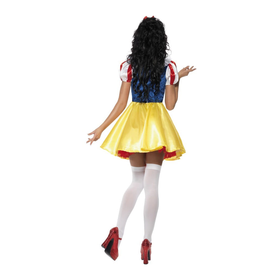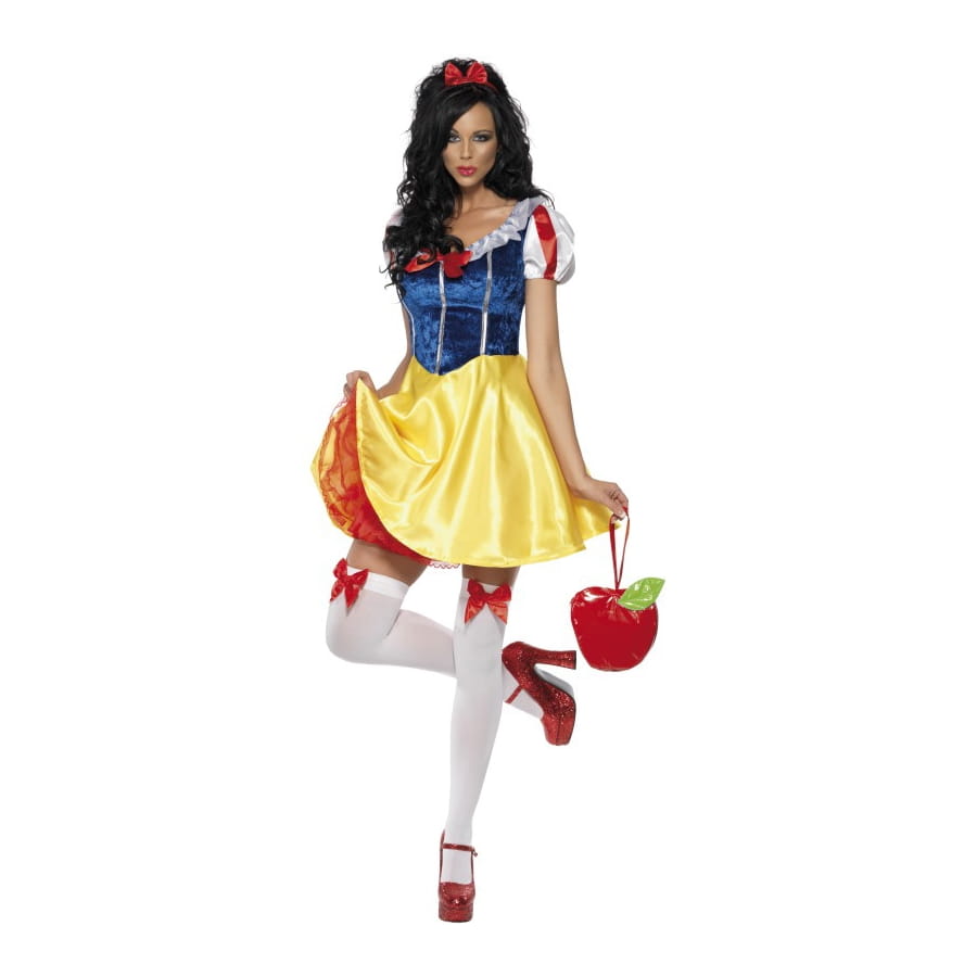 Déguisement de Blanche, pour femme, composé d'une robe bleue, jaune, blanche et rouge, d'un bandeau rouge et d'un tour de cou.