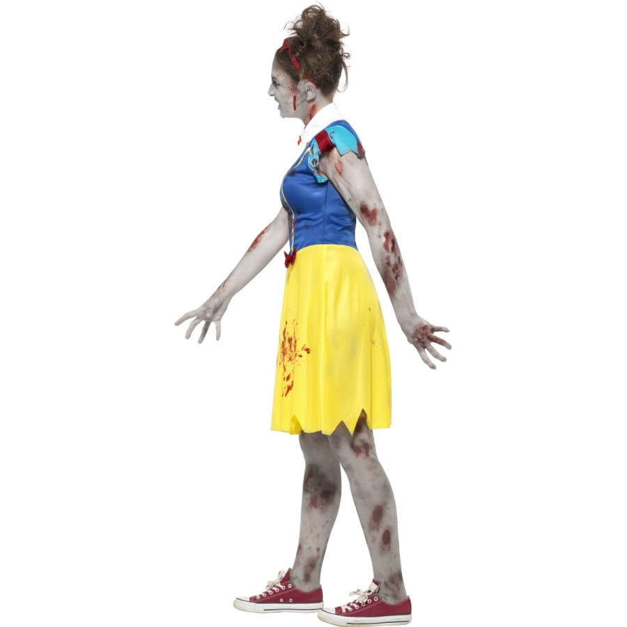 Vous retrouverez la robe de la princesse Blanche dans ce déguisement, écourtée et déchiquetée, mais toujours de couleur bleue pour le haut avec un col blanc, et de couleur jaune pour le bas avec des noeuds rouges au niveau de la taille.