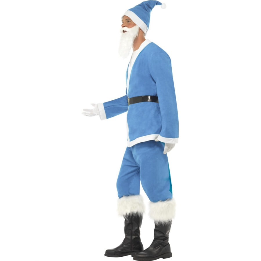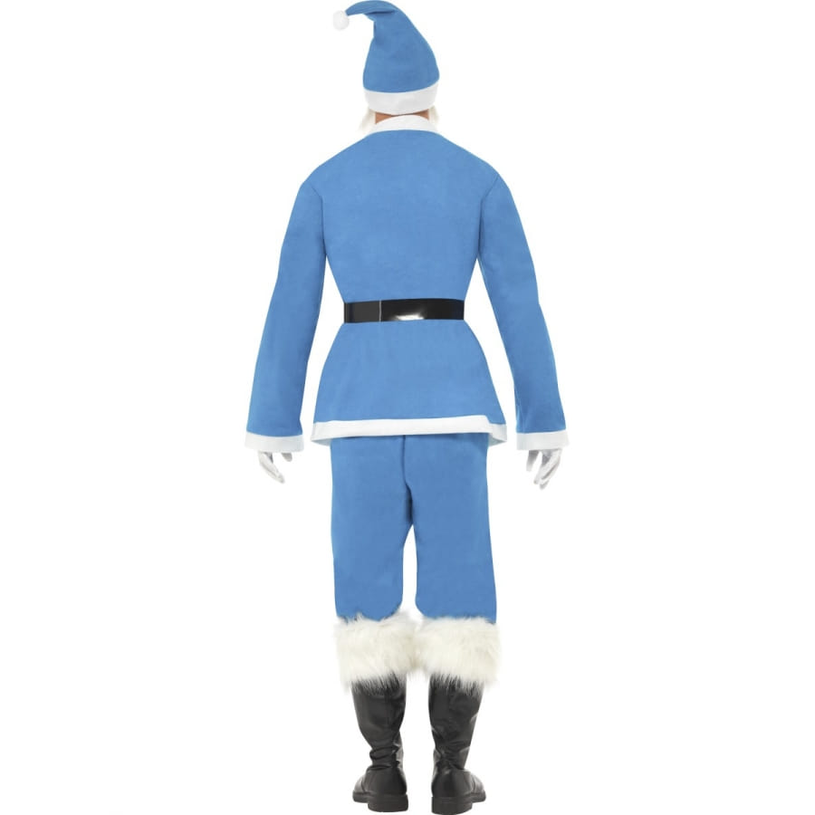 Déguisement de Père Noël de couleur bleue, pour homme, composé d'une veste, d'un pantalon, d'un chapeau à pompom, d'une barbe blanche et d'une ceinture noire. Adoptez une couleur plus douce et fraîche à l'occasion de Noël pour surprendre les enfants!