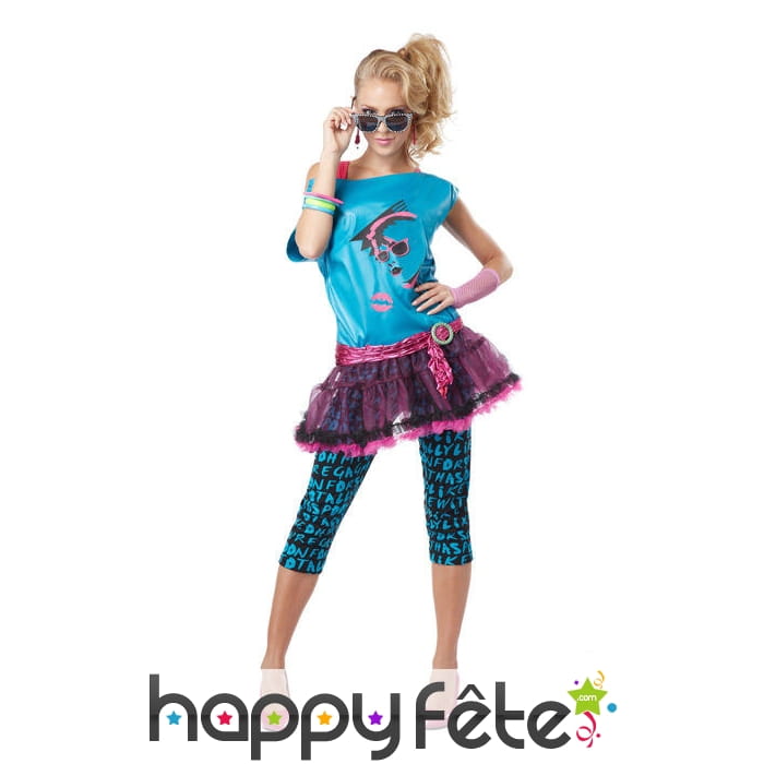 Si les années 80 vous manquent, vous pourrez réinventer cette époque en portant, pendant un carnaval ou une soirée costumée, ce déguisement bleu imprimé années 80 pour femme.