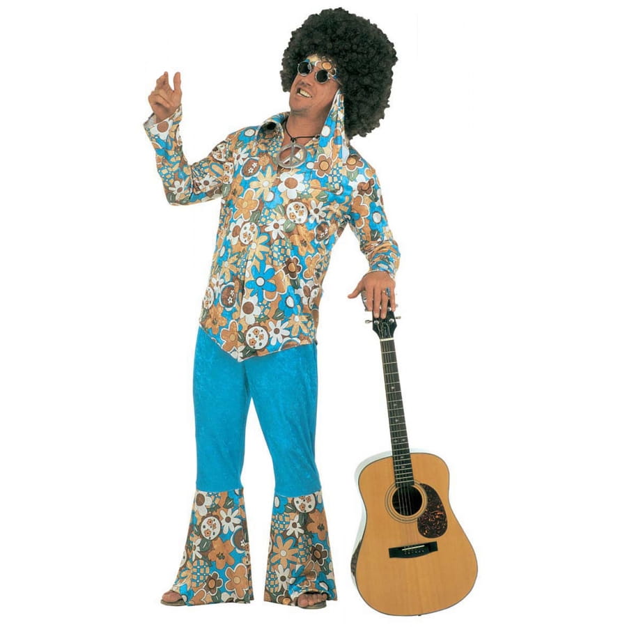 Messieurs, bienvenue dans l'ère hippie ! Votre look va faire un petit retour en arrière grâce au déguisement bleu imprimé hippie pour homme. Il est principalement formé par une tunique et un pantalon imitation velours. La tunique est à manches longues, parsemée de motifs fleurs présentés dans divers tons marron et bleus. Le pantalon est un modèle à pattes d'éléphant de couleur bleue. Le bas du pantalon est également orné de motifs en fleurs marron et bleus. Comme accessoire, vous aurez droit à un superbe bandeau de couleur assortie à la tunique, qu'il vous suffira d'attacher. Comme tout hippie qui se respecte, vous pouvez adopter une paire de lunettes noires ou une grosse perruque, plusieurs modèles sont disponibles sur happyfete.