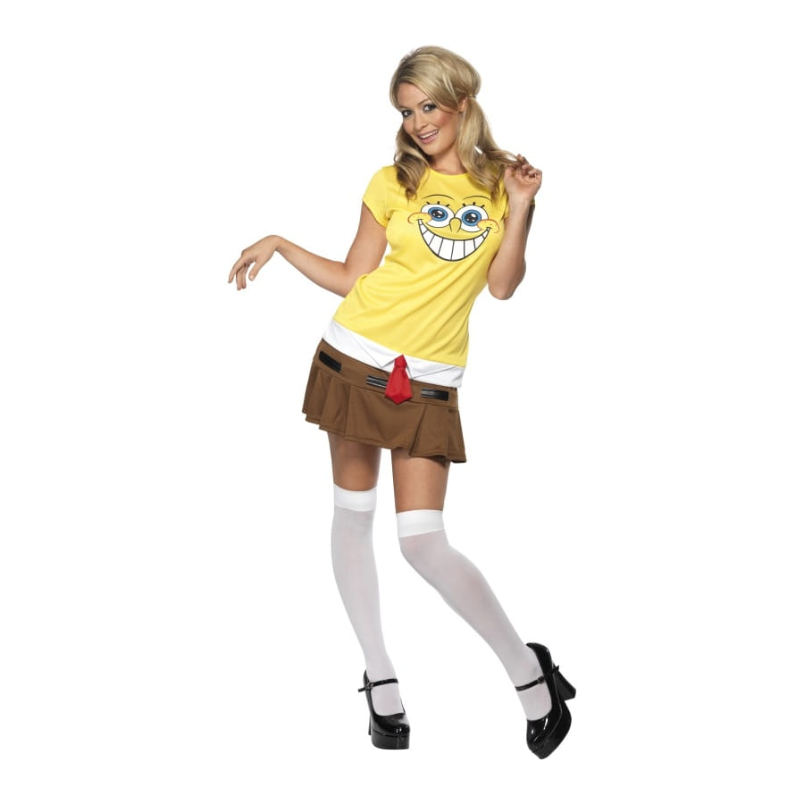 Déguisement de Bob l'Eponge, pour femme, composé d'une mini-robe tout en un. Le haut de la robe est jaune avec un imprimé Bob l'Eponge tandis que la ceinture est en forme de col de chemise avec cravate et le reste de de la robe est de couleur marron. Le tout est disponible en taille XS, S ou M. Vous ferez fureur parmi les fans de BD.