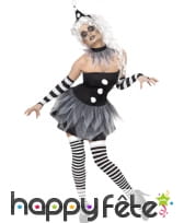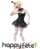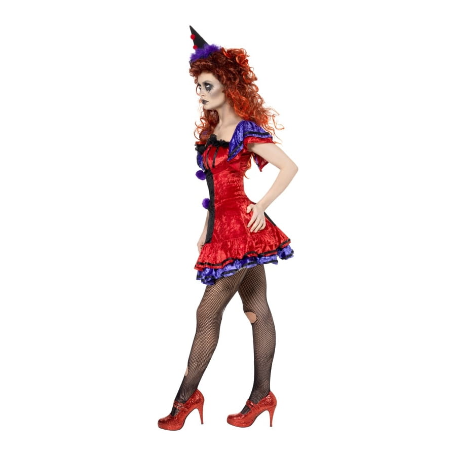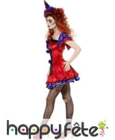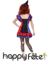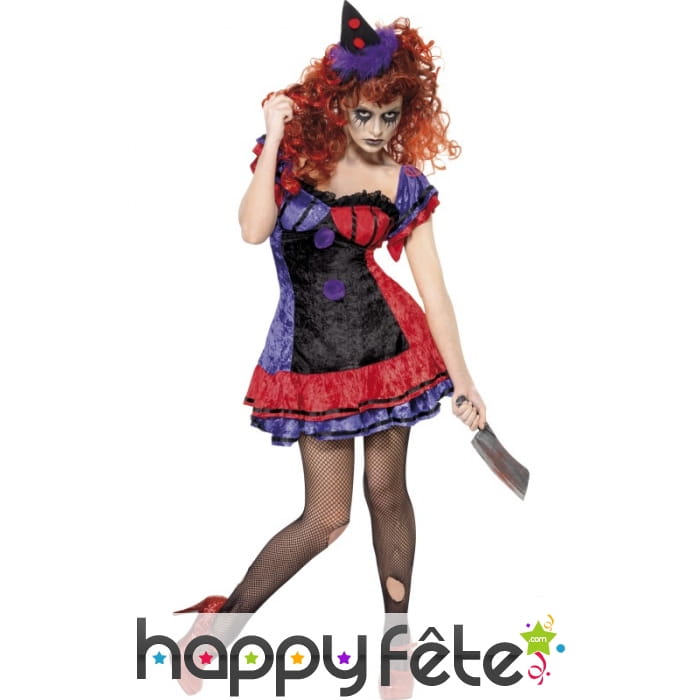 Déguisement de clown bobo, pour femme, composé d'une robe et d'un chapeau violets, noirs et rouges. Ce dernier est tout petit et pointu, orné de pompoms et de marabout. Les tailles disponibles sont le S, le M, le L et le X1. Choisissez un déguisement original mais effrayant tout de même pour Halloween.