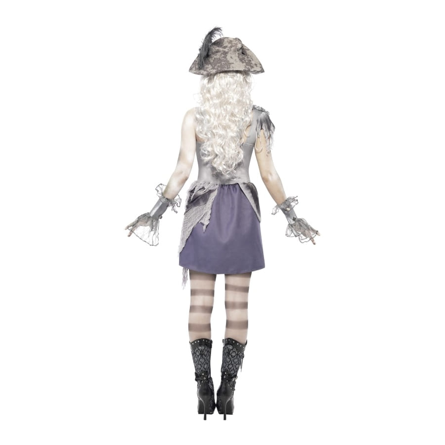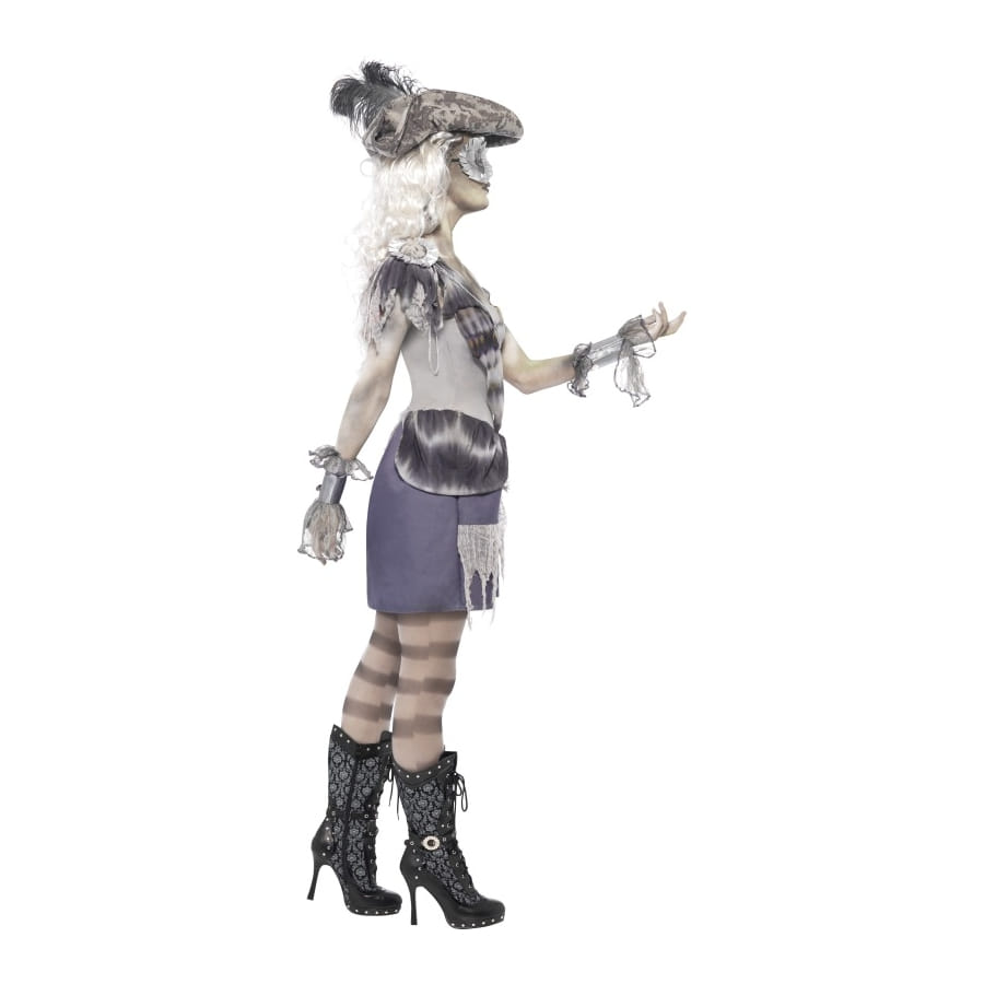 Déguisement de Madame Voyage, pour femme, composé d'une robe grise et blanche et d'un cache-oeil assorti en forme de coeur. La robe est cousue pour un effet rapiécé et déchiré, pour accentuer le côté "zombie" de votre tenue de boucanière. Elle est disponible en taille S, M ou L. Malgré l'apparence vieux et morbide, cette robe vous donnera tout de même un air sexy.
