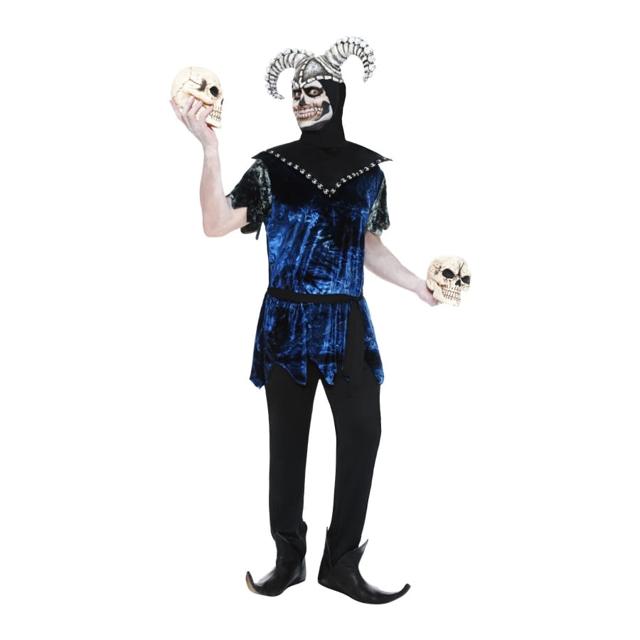 Déguisement de bouffon gothique, pour homme, composé d'une tunique bleue et noire, d'un col noir, d'une ceinture noire et d'un masque en latex blanc, noir et gris orné de deux cornes de bélier. Ce déguisement est disponible en taille S, M ou L. Cet ensemble très original conviendra parfaitement à une fête médiévale ou à une soirée d'Halloween.