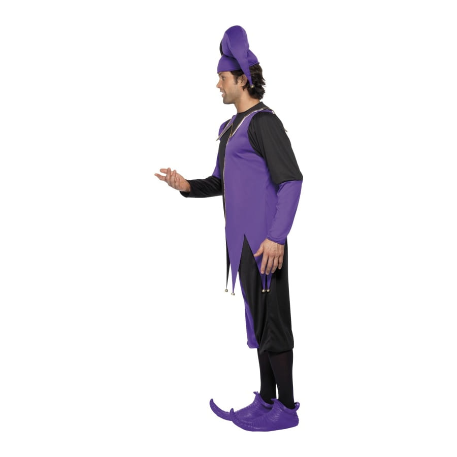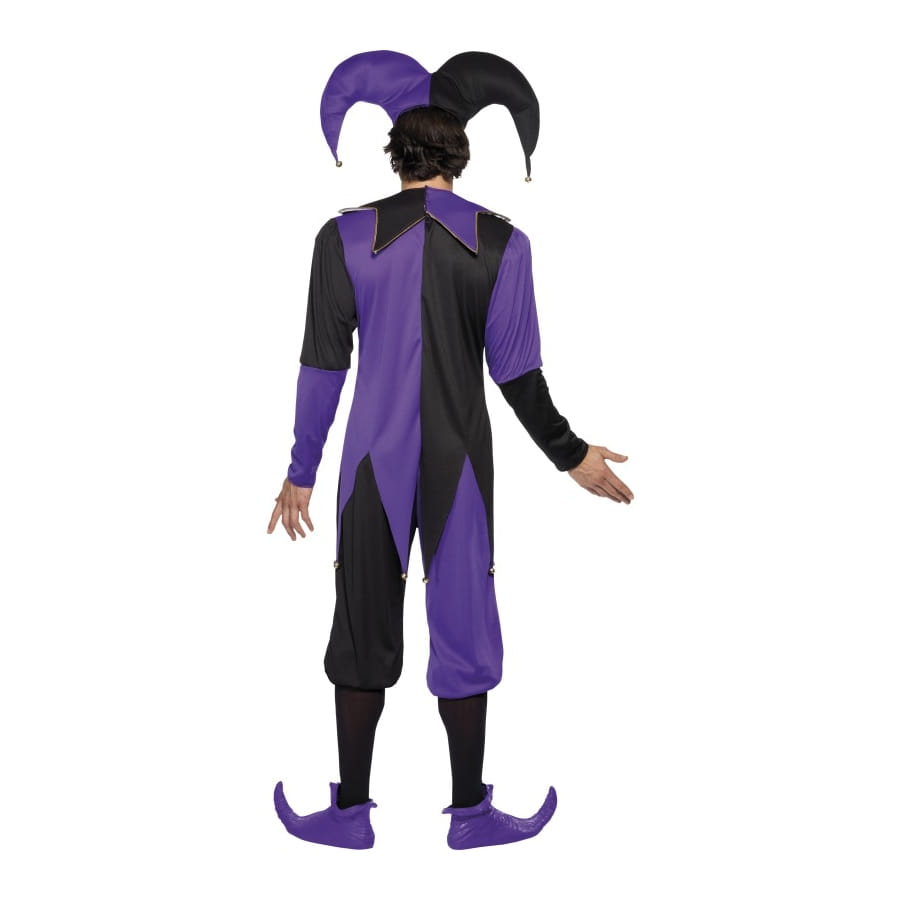 Déguisement de bouffon du roi médiéval, pour homme, composé d'un top avec collerette, d'un chapeau et d'un pantalon. L'ensemble entier est moitié violet et moitié noir. Il vous suffit d'enfiler ce déguisement et cela égaiera l'atmosphère de votre fête.