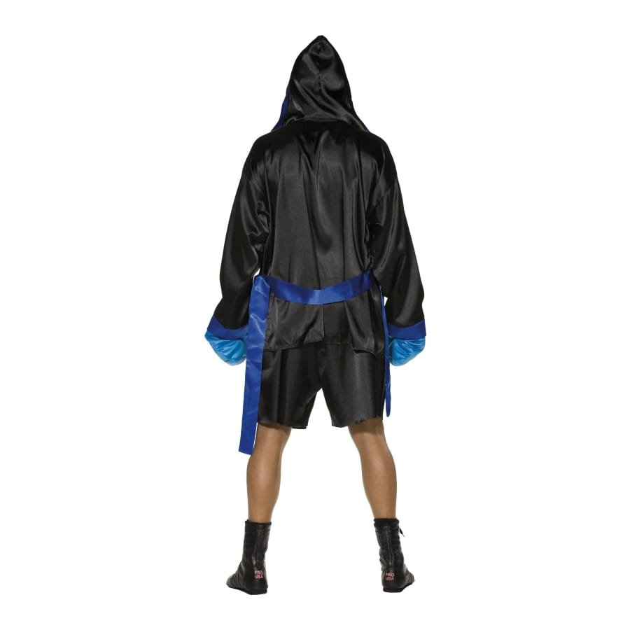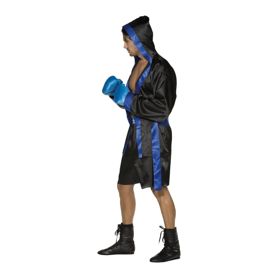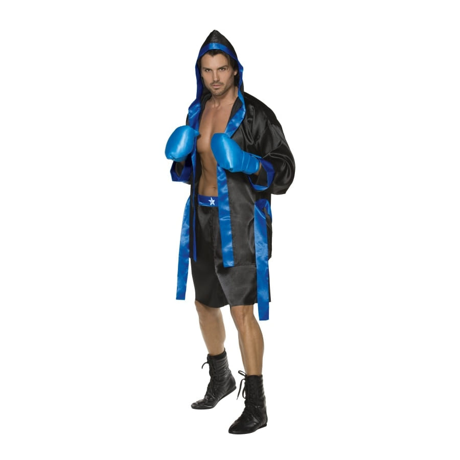 Déguisement de boxeur, pour homme, composé d'un top en satin bleu et noir, d'une ceinture assortie et de gants de boxe bleus. L'ensemble est une réplique parfaite de la tenue des plus grands boxeurs. Il fera fureur lors d'un enterrement de vie de garçon ou de jeune fille.