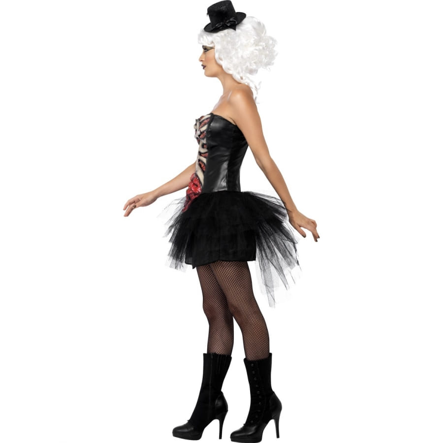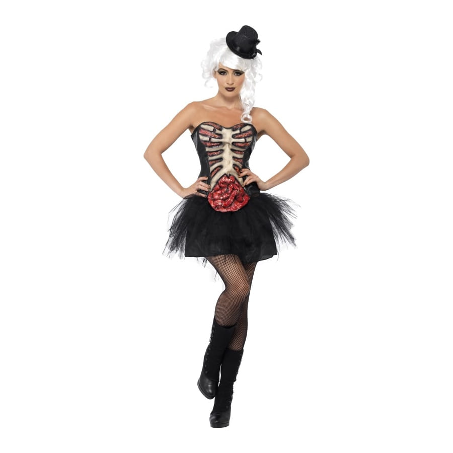 A Halloween, vous êtes intraitable question costume. Vous devez absolument avoir le plus beau, le plus effrayant, le plus original ! Optez pour ce déguisement burlesque squelette intestin. Pourquoi ? Il est à la fois hors du commun, réaliste, et va faire frissonner de terreur vos amis. Il est formé d'une robe corset de couleur noire très spéciale : votre cage thoracique ainsi que vos intestins en latex sont dessinés sur le devant, comme si votre peau et vos muscles avaient disparu. Leur couleur rouge inspire la couleur de votre sang. Portez des bottes et un petit chapeau pour une allure plus distinguée. Osez mettre un maquillage très gothique assorti avec la tenue. Ce costume est disponible en taille L (44-46) M (40-42) et S (36-38)