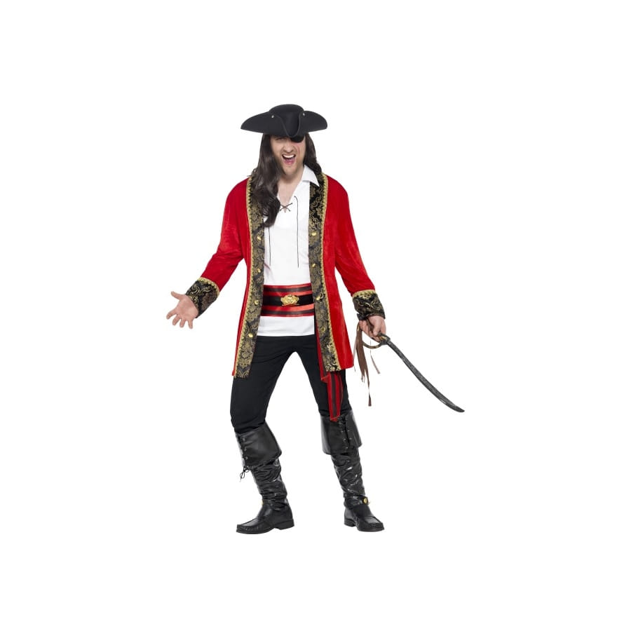 L'art du déguisement, c'est aussi savoir incarner son personnage même avec peu d'éléments. Ce déguisement capitaine pirate rouge grande taille par exemple comprend une veste de couleur rouge avec des bordures noires ornées de dorées, ainsi qu'une chemise blanche et une ceinture en tissu de couleur noire et rouge avec un ornement doré au milieu. Ces trois éléments combinés font tout de suite penser à un pirate et vous pouvez les garder tels quels avec un pantalon quelconque ou choisir d'agrémenter l'ensemble avec des tas d'autres accessoires comme un chapeau, un cache-oeil, une épée, un crochet, ou même une perruque, l'ensemble de ces accessoires étant disponible sur Happyfete.