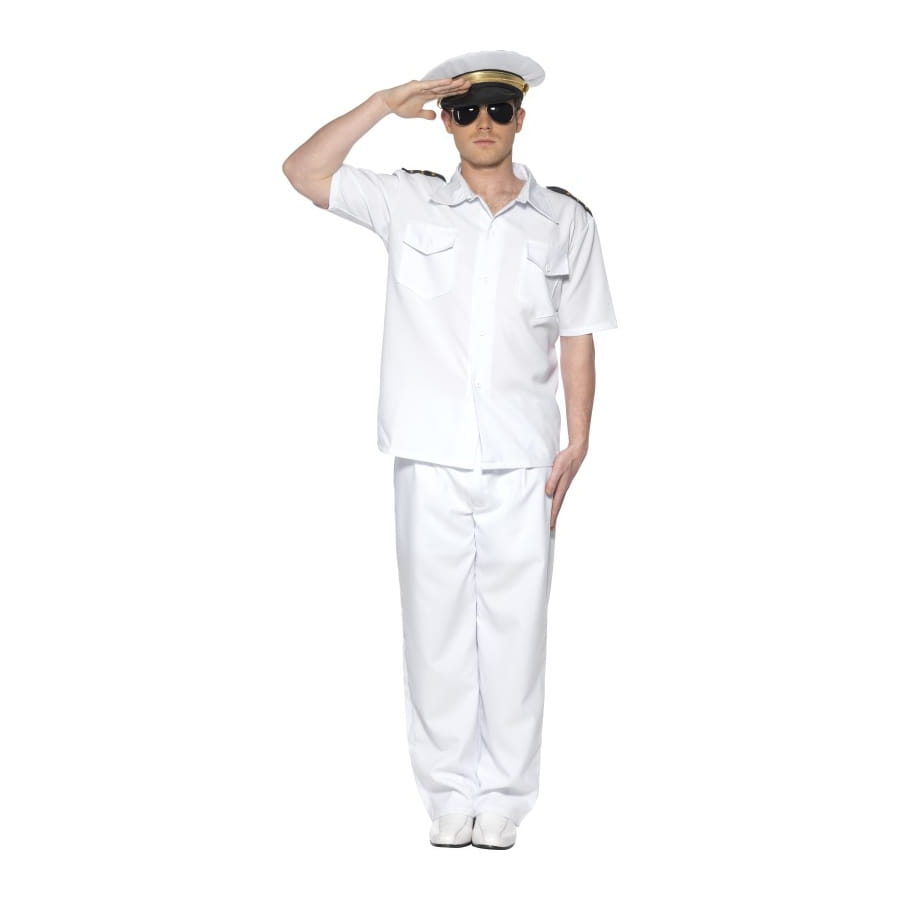 Déguisement de Capitaine de couleur blanche, pour homme, composé d'une veste à manches courtes, d'un pantalon et d'une casquette. Cet ensemble fera de vous un séduisant et brillant capitaine de bord.