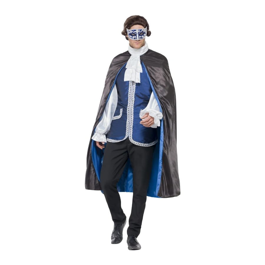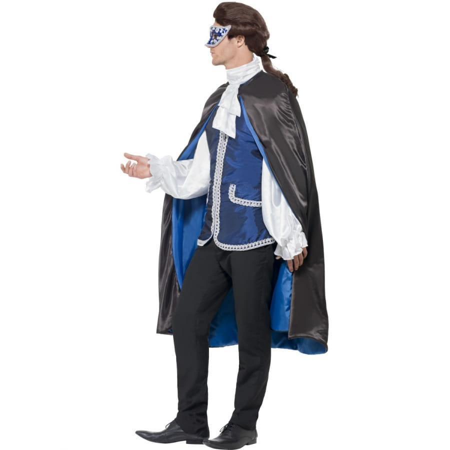 Déguisement de Casanova, pour homme, composé d'un top blanc et bleu et d'une cape en satin noir à revers bleu. Ils sont disponibles en taille S, M ou L. Vous pourrez vous déguiser en personnage mythique de l'ère Victorienne.
