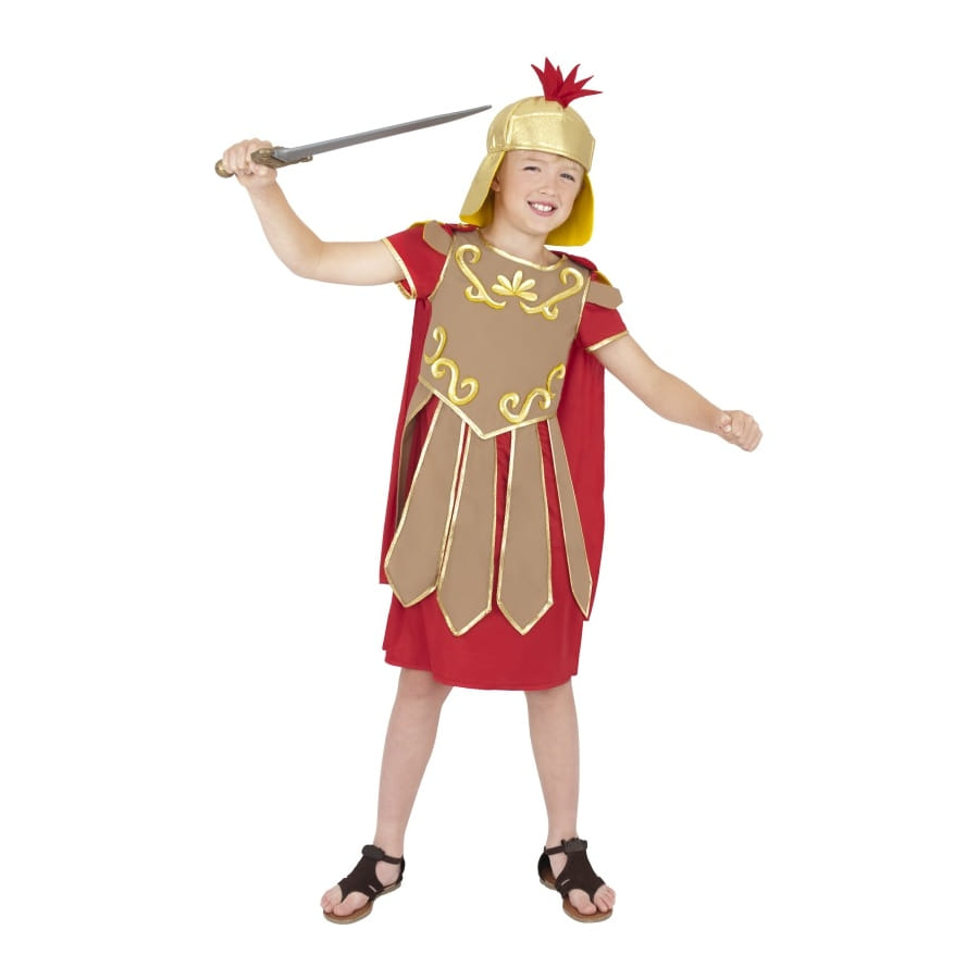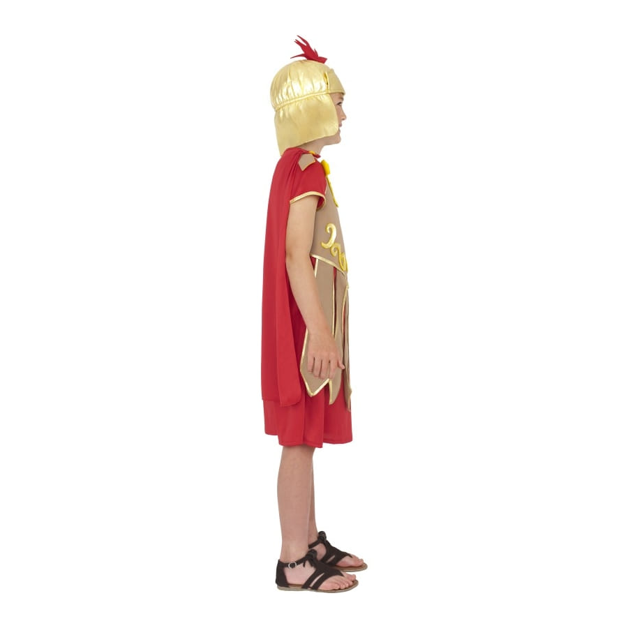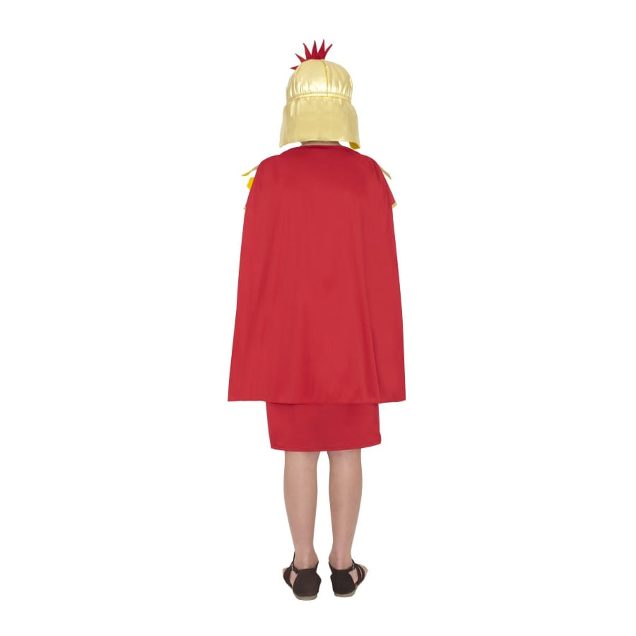 Déguisement de centurion romain, pour enfant, composé d'une tunique rouge, marron et dorée, d'une cape rouge et d'un casque doré et rouge. Cet ensemble peut être livré en taille S, M ou L, selon votre choix. Il fera de votre enfant un guerrier romain valeureux!