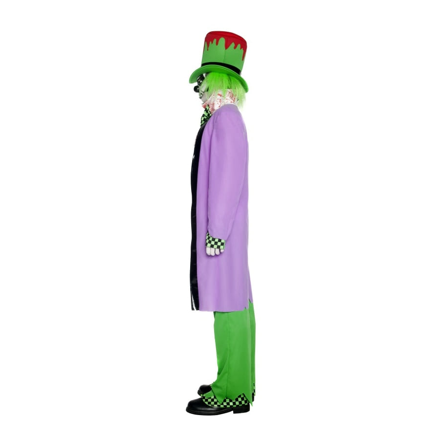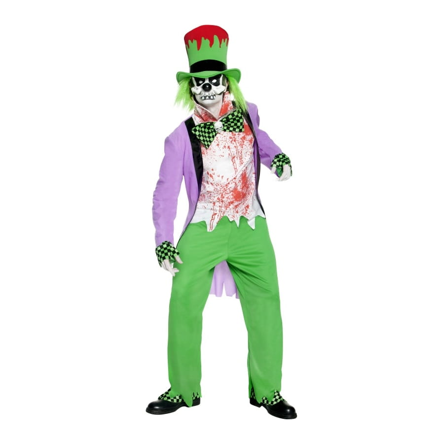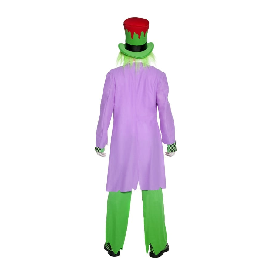 Déguisement de chapelier zombie, pour homme, composé d'un haut blanc, d'un pantalon vert, d'une veste mauve avec manches à carreaux verts et noirs, d'un masque de zombie, de couvre-chaussures et de gants blancs. La chemise est tâchée de sang pour un effet plus macabre. Cette tenue est disponible en taille S, M ou L. Enfilez-la pour une version revisitée d'Alice aux Pays des Merveilles.