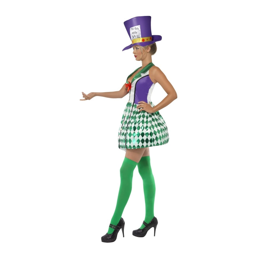 Déguisement de Chapelière Folle, pour femme ou adolescente, composé d'une robe et d'un chapeau. Les couleurs de l'ensemble varient entre le violet, le vert et le blanc. Il est disponible en taille S, M ou L. Ce déguisement original fera de vous la partenaire parfaite du Chapelier Fou d'Alice aux Pays des Merveilles pour une fête remplie de folies!