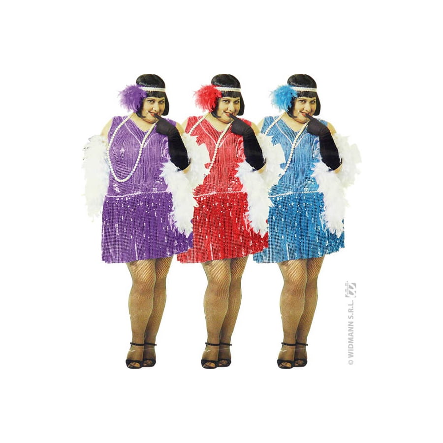 Vous serez la plus belle pour la soirée avec ce déguisement de charleston. De taille XL ce déguisement avec des paillettes dessus vous pourrez le porter si vous incarnez une danseuse. Il est composé d'une robe à franges, avec un col en V. Il est aussi composé d'un serre-tête avec une plume sur le coté. De couleur rouge, violet ou bleu.