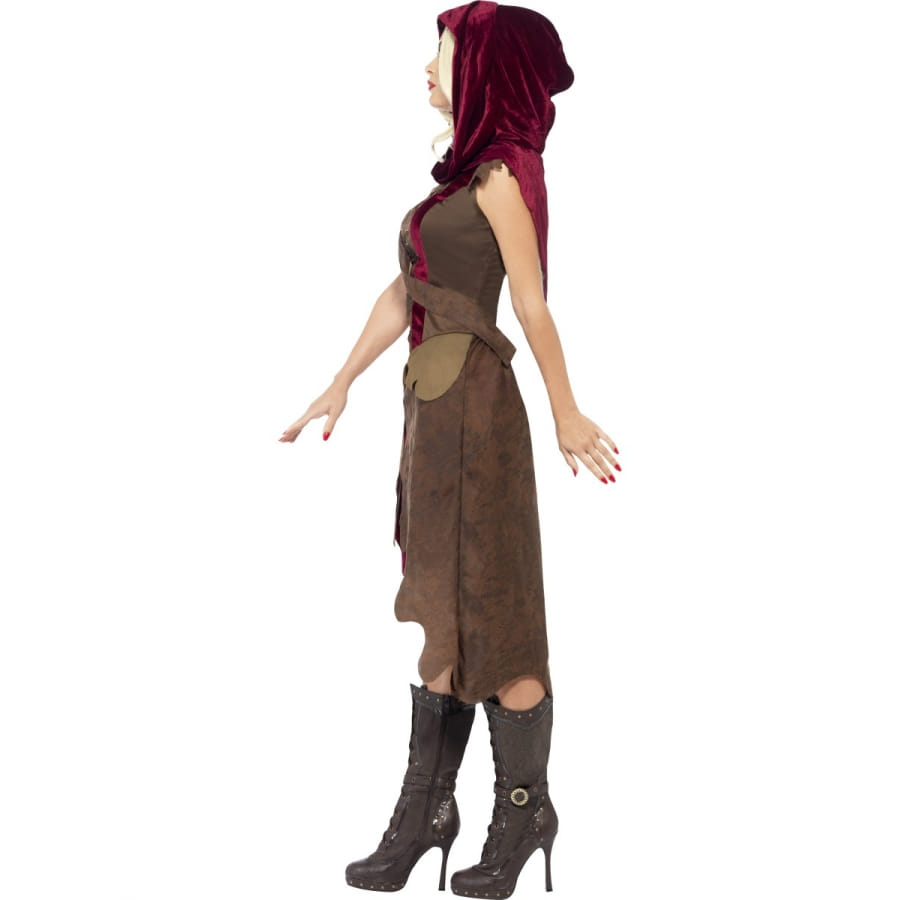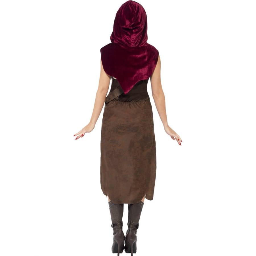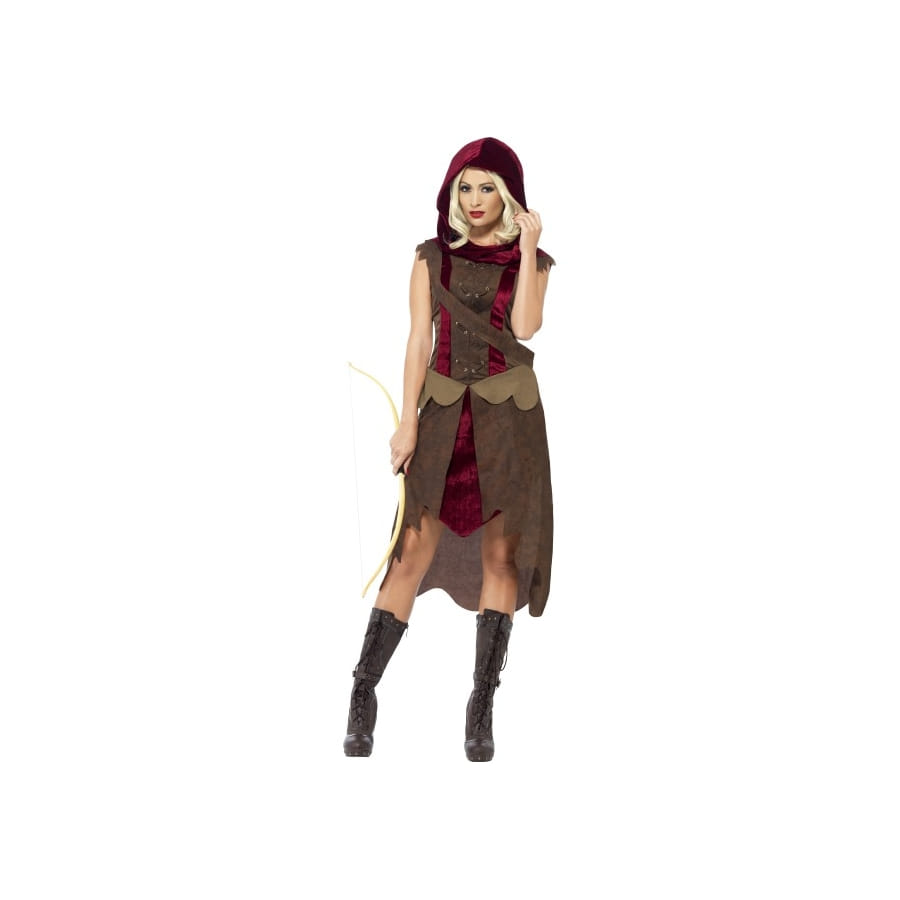 Pensez action et aventure avec ce déguisement de chasseuse à l'arc, Mesdames. Laissez-vous aller dans la peau d'un personnage courageux, habile et passionné. Vous aurez, avec ce déguisement, une jolie robe sans manches de couleur marron ornée d'une partie en bordeaux avec des lacets au niveau de la poitrine. Cette robe est évasée et asymétrique. Vous aurez également une ceinture de couleur marron et une capuche de couleur bordeaux. Les tailles que nous proposons sont : L, M et S. Vous n'aurez plus qu'à trouver un arc et des flèches si vous voulez agrémenter un peu plus votre déguisement. Une paire de bottes serait de rigueur avec un costume de ce genre.