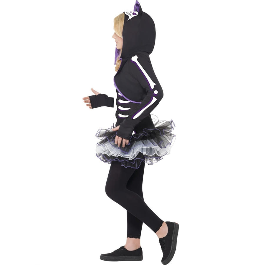 Ce déguisement de chat squelette pour fille votre fille pourra le porter pour le carnaval, ou encore pour un gouter d'anniversaire. Ce déguisement est composé d'une robe tutu de couleur noir avec le dessin d'un squelette dessus et de voile au bas, il est aussi composé d'un capuchon avec deux oreilles dessus.