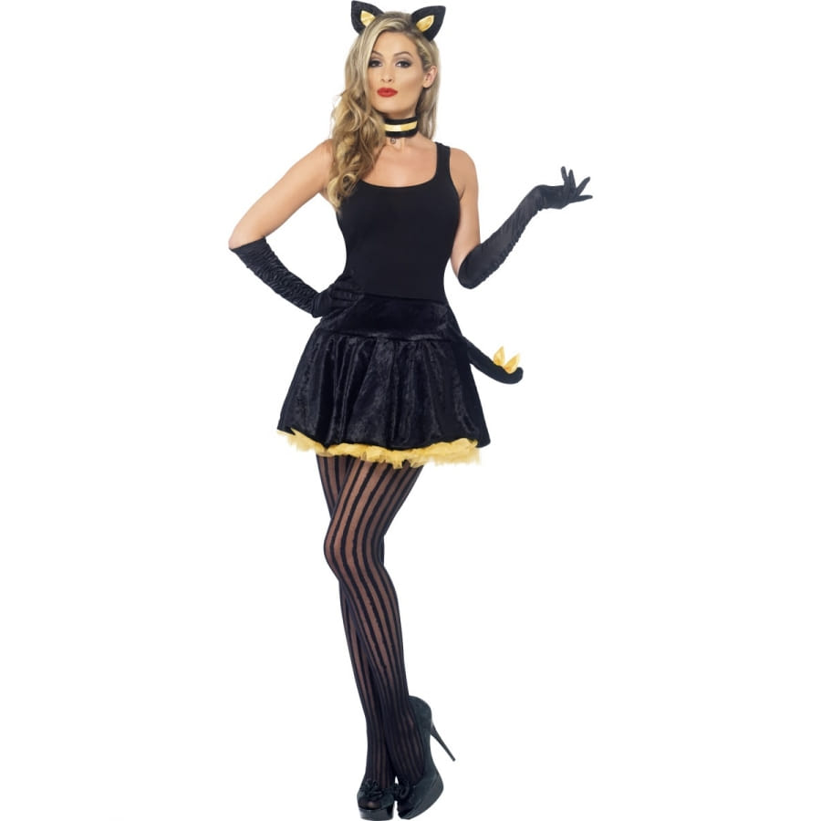 Déguisement de chat sexy, pour femme, composé d'une jupe tutu, d'un collier et d'oreilles. Ces trois accessoires sont de couleur noire avec des touches jaunes. Elle vous donnera un air félin et sexy, idéal pour un fête entre adultes basée sur le thème des animaux.