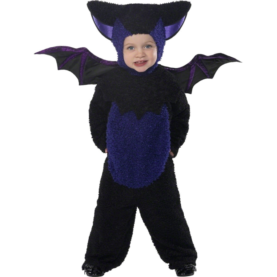Déguisement de Mini Monster chauve-souris, pour enfant de 3 à 4 ans, composé d'une combinaison avec cagoule et d'une paire d'ailes. Ces deux accessoires sont de couleur noir et violet. La cagoule est ornée d'oreilles de chauve-souris pour plus de crédibilité. C'est un déguisement très mignon que votre enfant pourra porter à l'occasion d'Halloween.