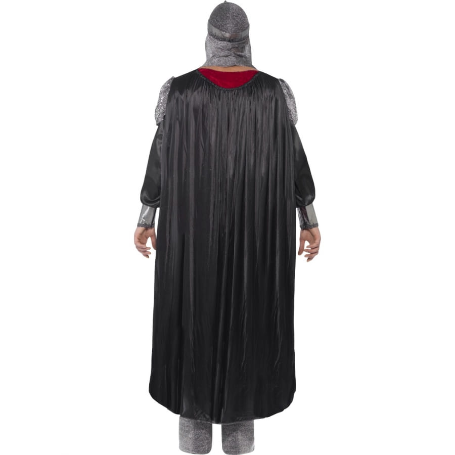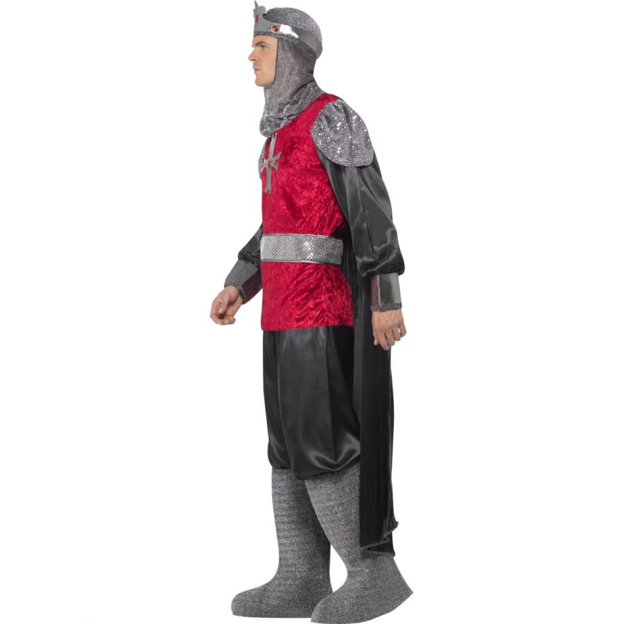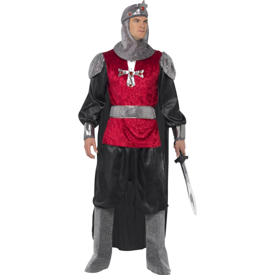 Déguisement de chevalier, pour homme, composé d'une tunique rouge, d'un pantalon noir, d'une capuche, d'une ceinture et de couvre-bottes argentées. Le tout est disponible en taille S, M ou L. Mettez-vous au service du Roi en vous transformant en chevalier.
