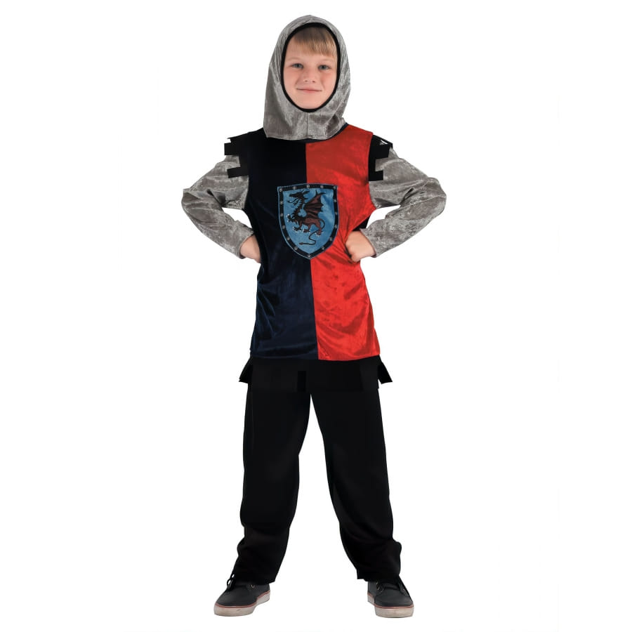 Voici le costume qui fera de votre garçon le chevalier le plus valeureux du royaume ! Commencez par la tunique, une pièce maîtresse qui a tout pour plaire. Avec son effet velours des plus douillets, elle se pare de nuances grises, rouges et bleues. Mais ce qui la rend vraiment spéciale, c'est cet écusson placé fièrement sur le devant. Symbole de bravoure et d'honneur, il montre que son porteur est un chevalier de haut rang.