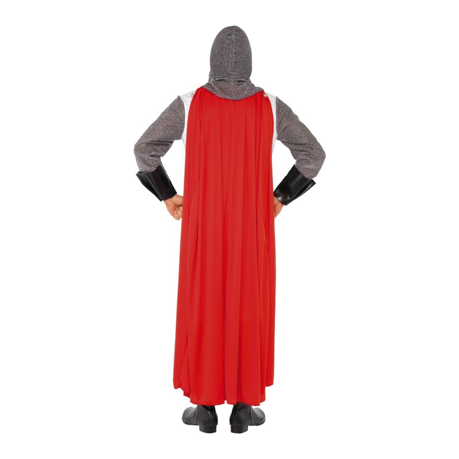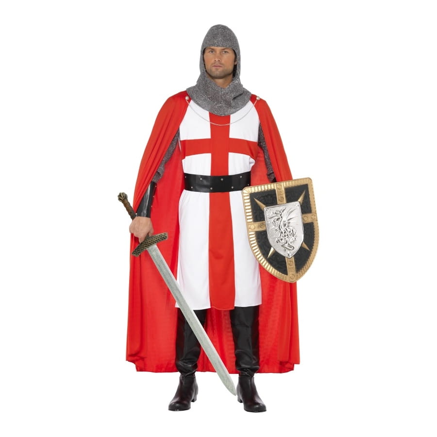 Déguisement de chevalier Saint Georges, pour homme, composé d'un chapeau gris, de bracelets en métal noir et d'un top rouge et blanc avec cape rouge. Incarnez un chevalier vaillant et courageux au service du roi à l'occasion d'une fête médiévale.