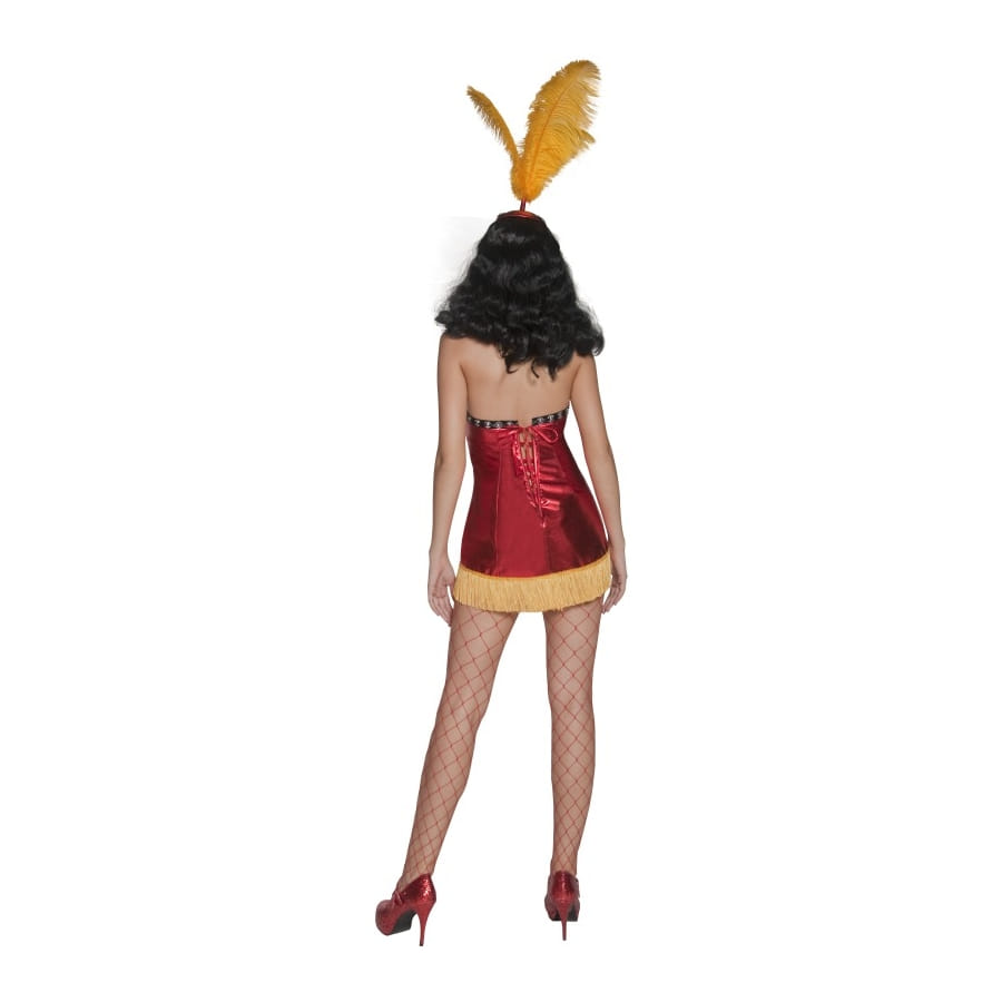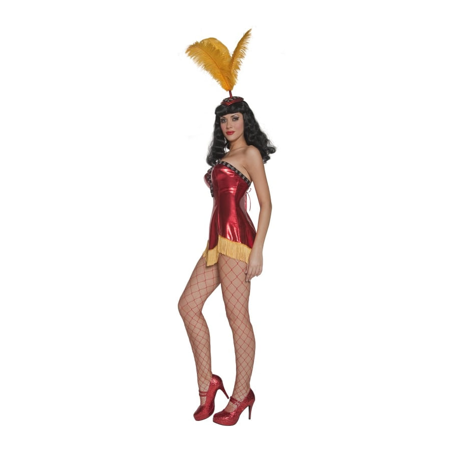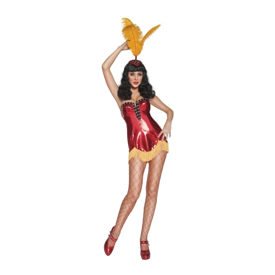 Déguisement de trapéziste, pour femme, composé d'une robe rouge et jaune et d'un chapeau à plumes jaunes. La robe est ornée de franges et possède un effet vinyle tandis que le chapeau est brillant. Cet ensemble est disponible en taille S, M ou L. Avec cet ensemble, vous pourrez vous déguiser en membre de troupe de cirque!
