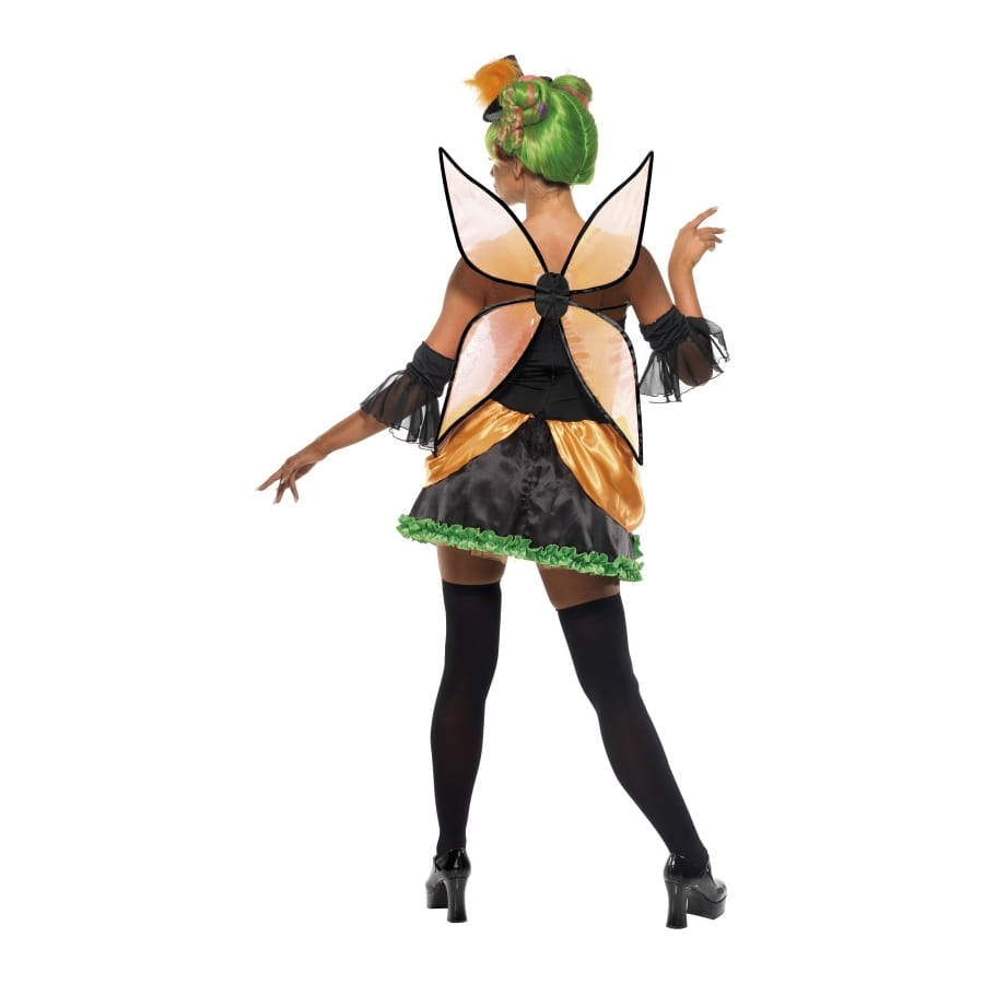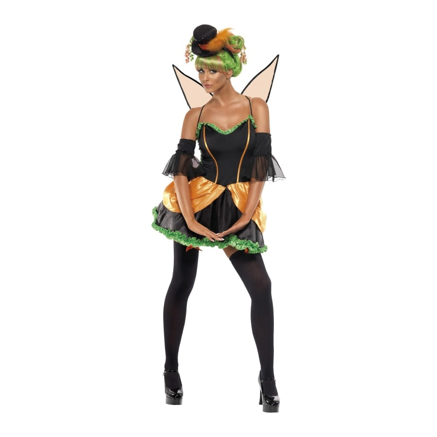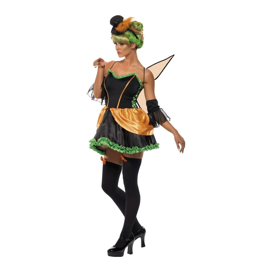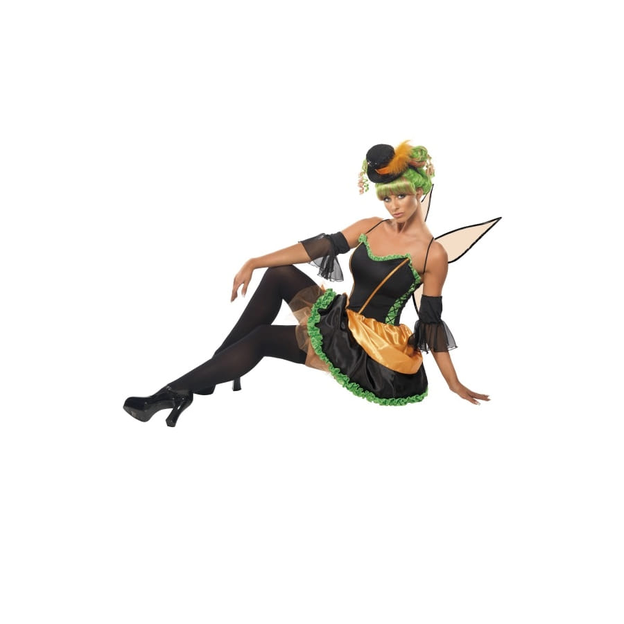 Déguisement de citrouille sexy de couleur noire, orange et verte, pour femme, composé d'une robe, d'une paire de manches, d'un chapeau, d'une paire d'ailes et de collants. Les ailes sont orange transparent avec une fine bordure noire. La robe est décorée de volants verts et de satin orange et le chapeau est orné d'une plue orange. On aura jamais vu une citrouille aussi sexy!