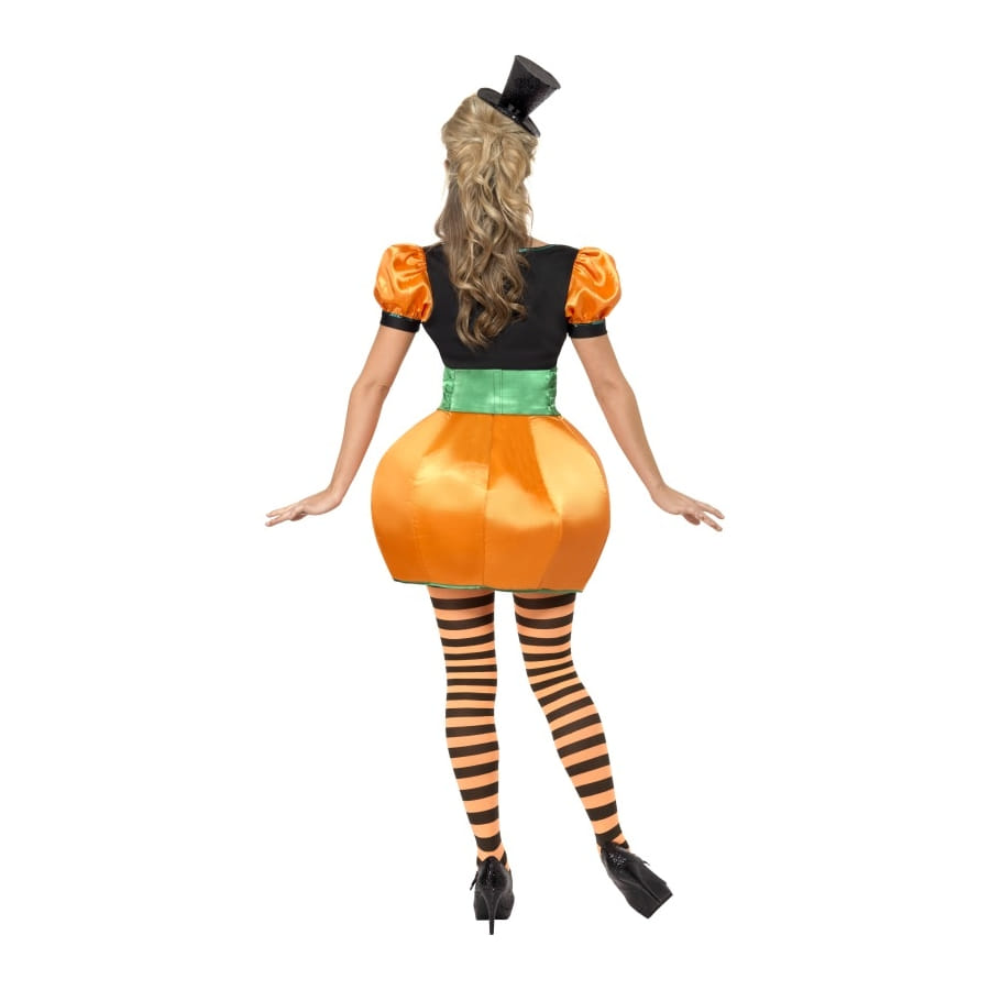 Déguisement de femme citrouille composé d'un top, d'une jupe et d'une ceinture. Le top est de couleur noire et orange avec des manches bouffantes, tandis que la ceinture est verte et la jupe est bouffante, de couleur orange et en forme de citrouille. Cet ensemble est disponible en taille XS, S, M ou L. C'est le déguisement idéal pour Halloween.