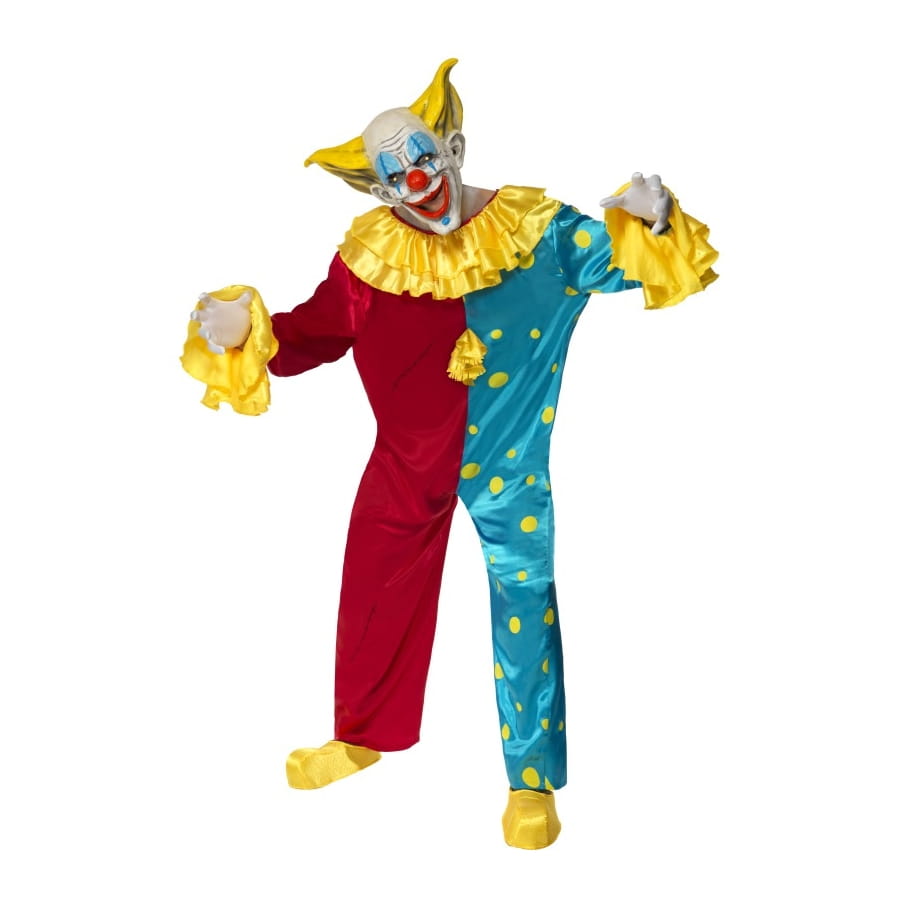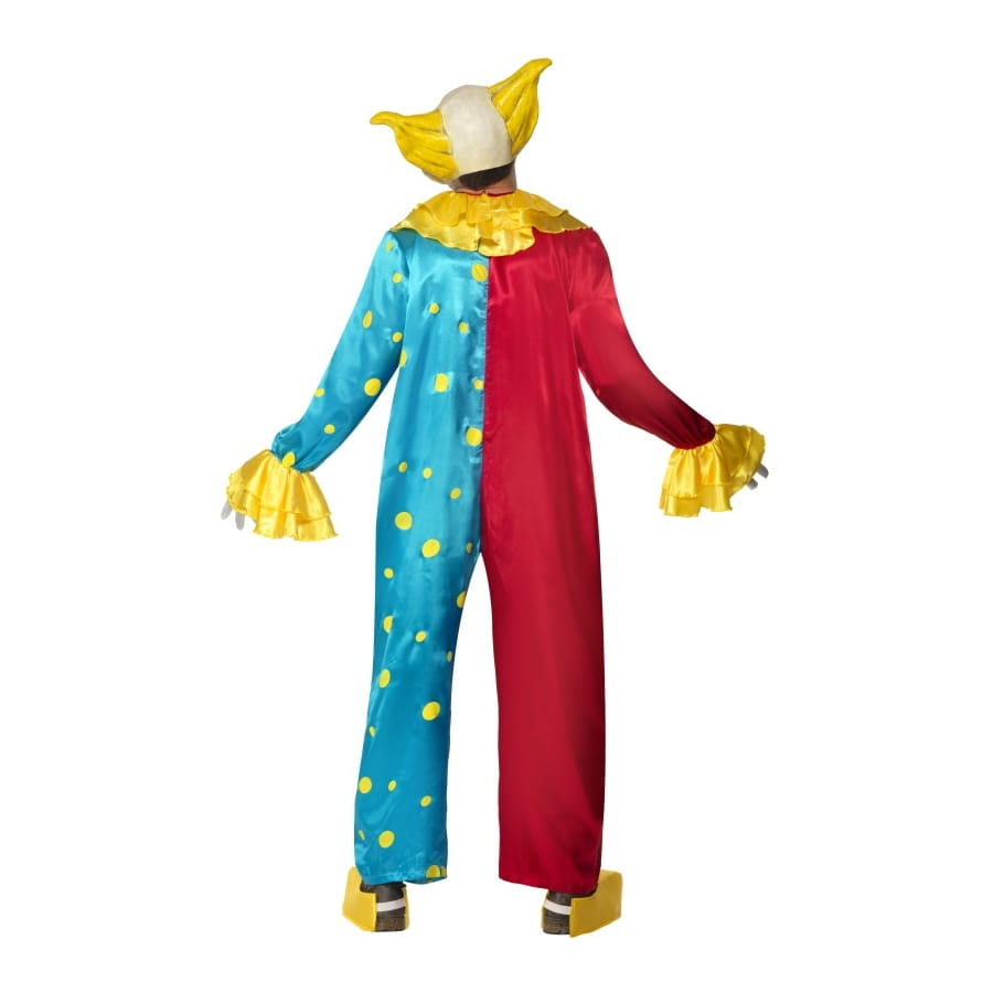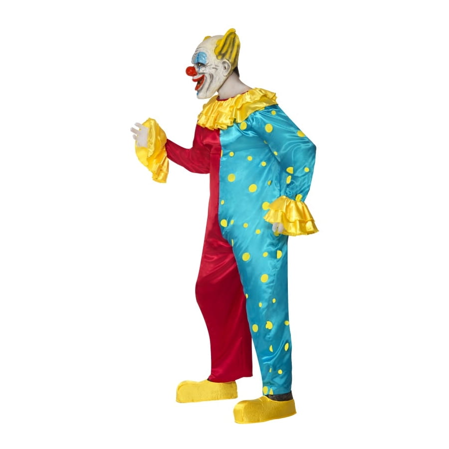 Ce costume de clown est parfait pour Halloween ou encore pour le carnaval. Vous pouvez aussi le revêtir pour une fête basée sur le cirque. Ce déguisement est un masque blanc, d'une combinaison, bleu, rouge et jaune ainsi que de couvre chaussures jaune.