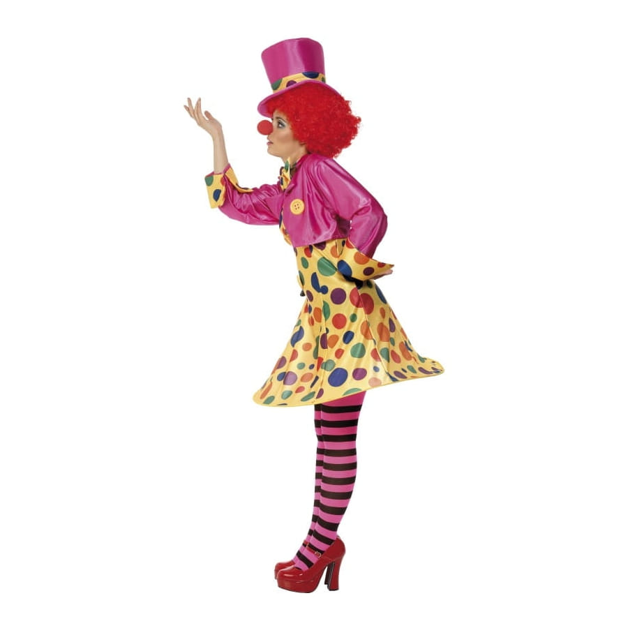 Ce costume de clown pour femme fera sourire plus d'un pour le carnaval. Vous pourrez le porter aussi pour une fête avec des enfants, ils seront aux anges en vous voyant dans ce déguisement de taille L. Il est composé d'un chapeau rose avec une bande multicolore, d'une veste rose avec des motifs multicolore, d'une robe avec cerceau au bas, cette robe est multicolore, avec nœud papillon de la même couleur que la robe ainsi que de collant à rayure noir et rose.