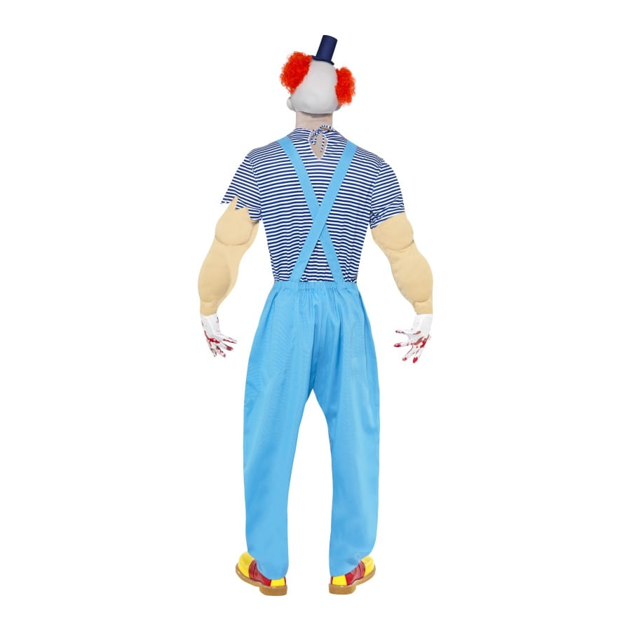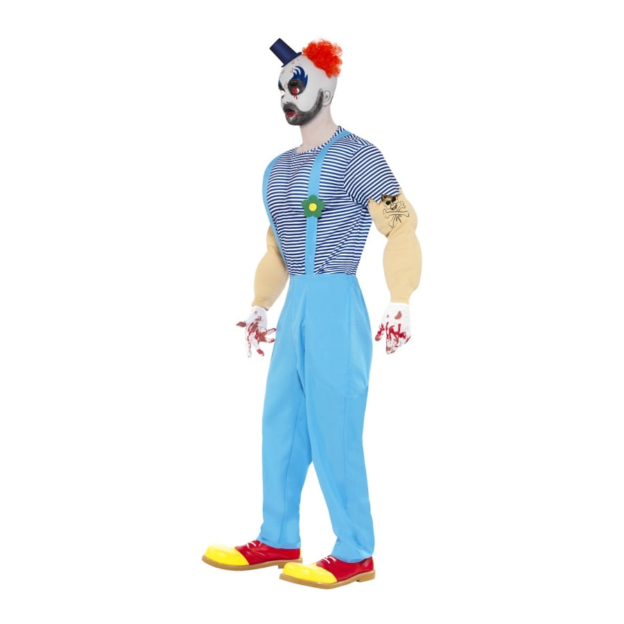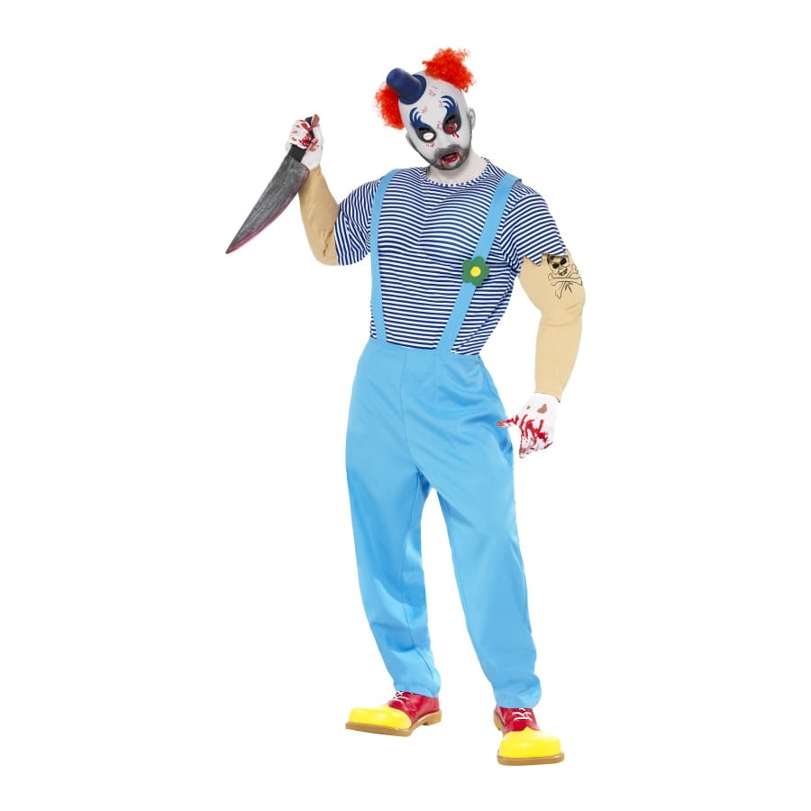 Ce déguisement de clown fou est parfait pour Halloween ou encore pour une fête ayant pour thème le cirque. Ce déguisement est un pantalon de couleur bleu avec des bretelles bleues, d'un top musclé de couleur beige avec un tatouage d'une tête de mort dessus ainsi que d'un masque blanc qui a un air intriguant.