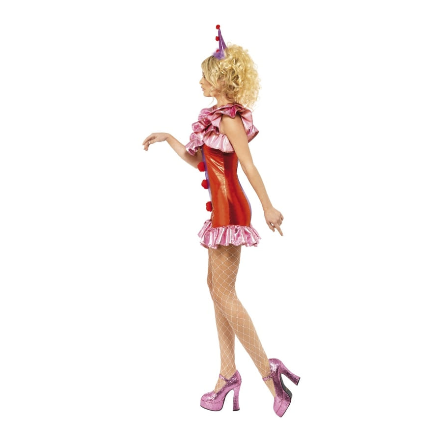Déguisement de clown joueuse, pour femme, composé d'une combinaison moulante et d'un mini-chapeau. La combinaison est riche en volants roses et pompoms rouges. Elle s'apprête parfaitement à vos formes pour vous donner un air de clown sexy! Choisissez la taille qui vous ira entre un S, M ou un L.