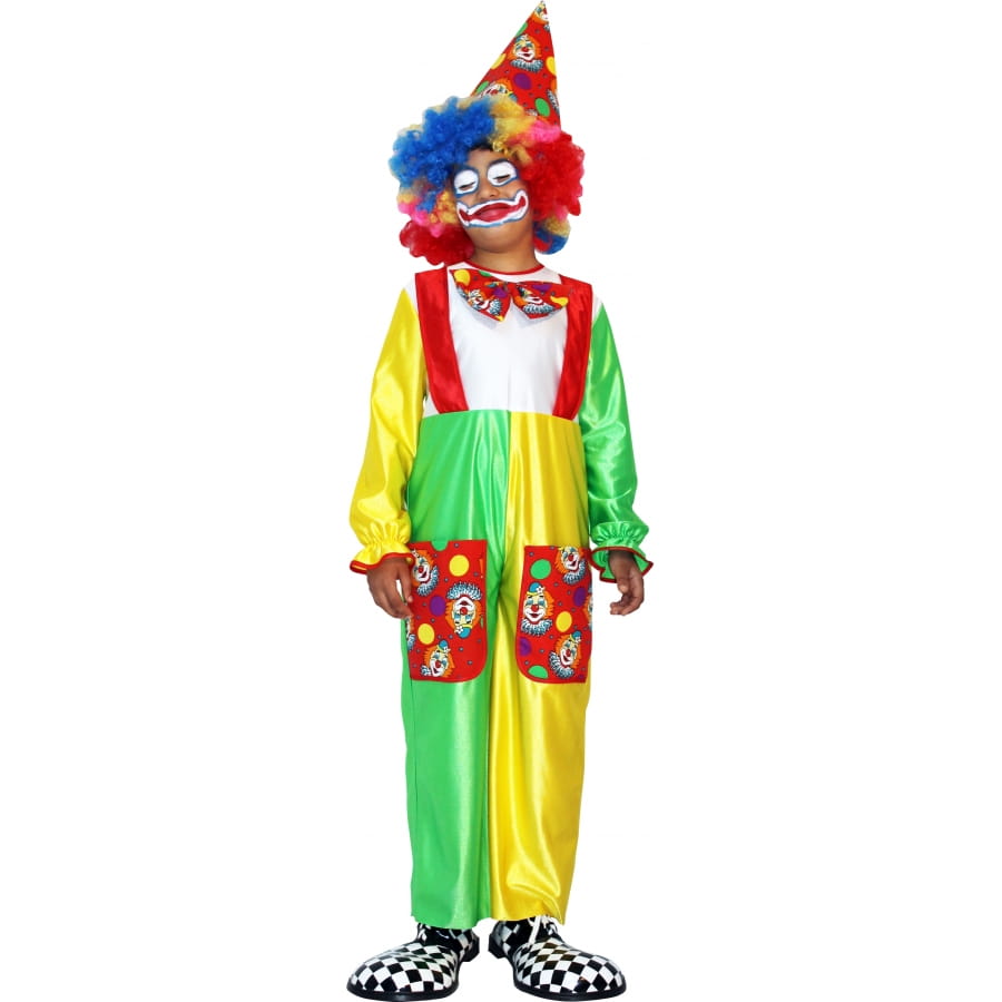 Déguisement de clown, pour garçon ou fille, composé d'une salopette avec noeud papillon et d'une coiffe multicolores. Cet ensemble est disponible en taille de 116, 128 ou de 140 centimètres. Votre enfant pourra faire rire ses amis lors d'un anniversaire avec ce déguisement!