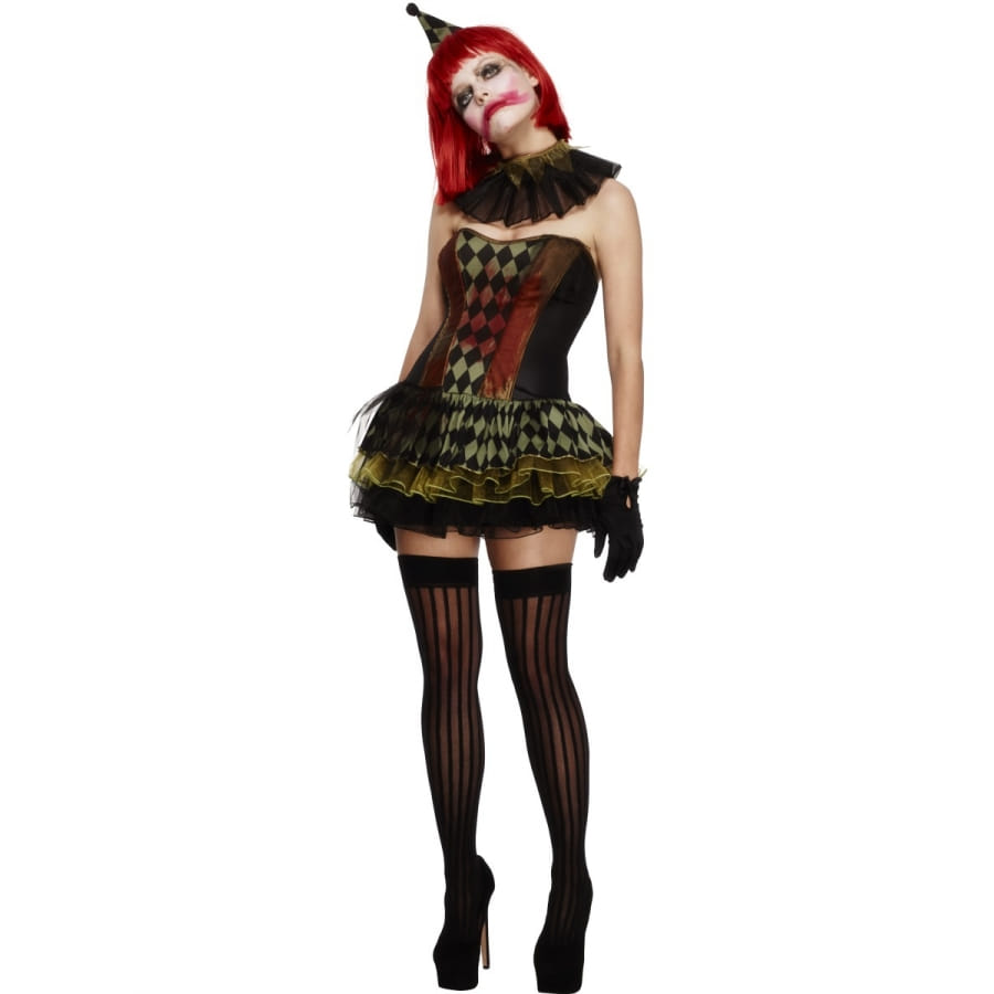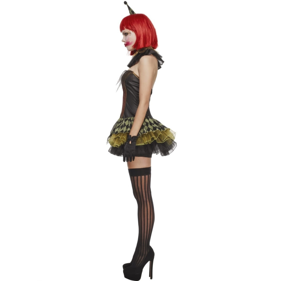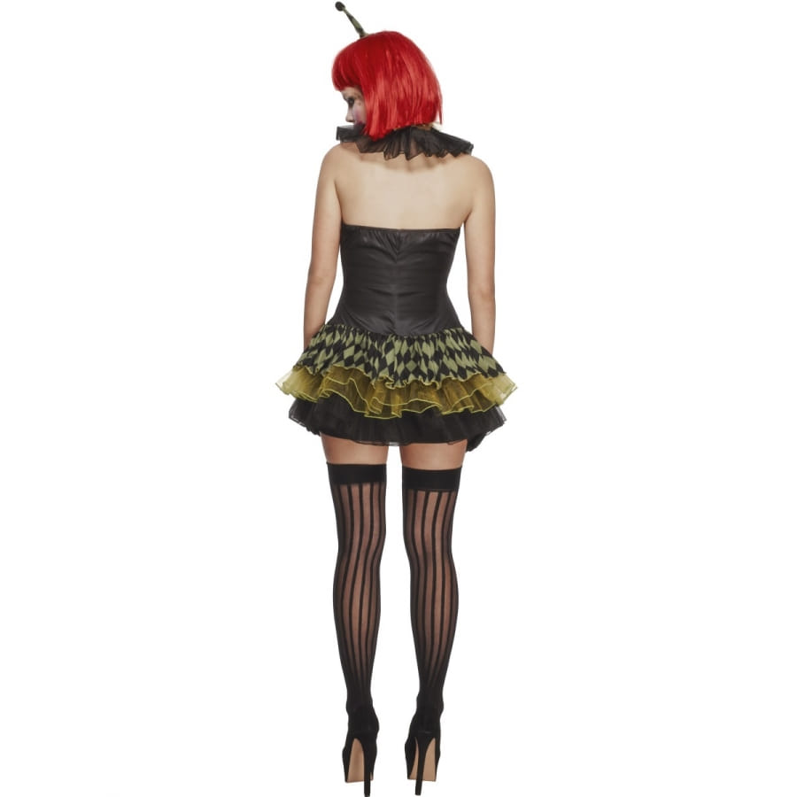 Un clown rigolo? Non, pas seulement : un clown charmant plein d'esprit! L’ensemble est imprimé de couleurs noire, rouge, et verte illustrant un motif damier. Il est constitué d'une robe avec jupette en tutu, d'une petite coiffe de clown, d'une paire de bracelets noirs en dentelles et d'une collerette noire, de la même matière. Complétez la tenue avec une paire de collants filets noirs et des talons à aiguilles noirs. Ce costume est disponible en taille S (correspondant à robe de taille 36-38), M (correspondant à robe de taille 40-42) et L (correspondant à robe de taille 36-38).